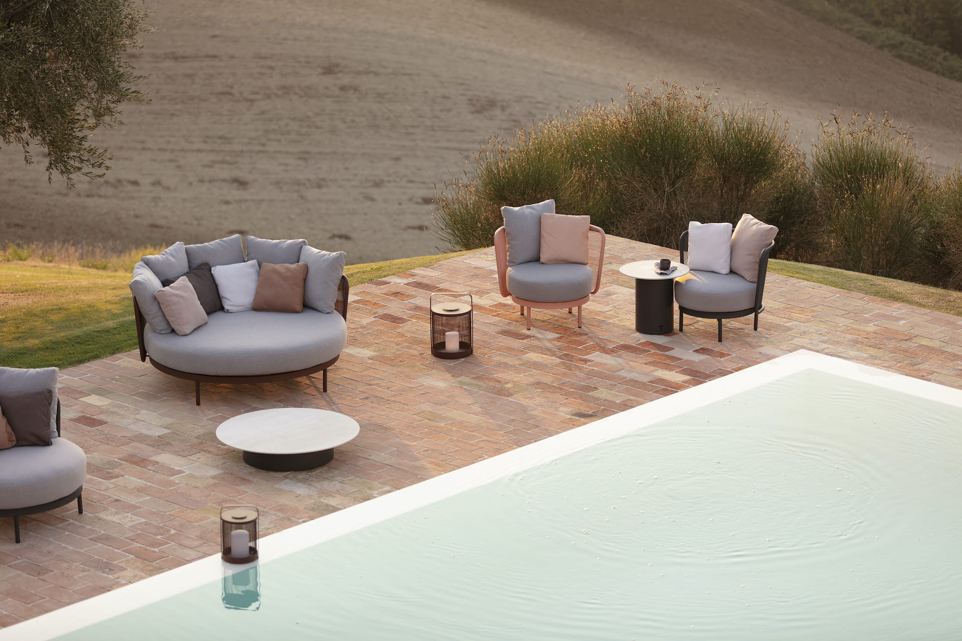 Tapicerka do wyboru w różnych kolorach wykonana z materiałów najwyższej jakości, które nie tracą koloru i są niezwykle przyjemne i miękkie w dotyku, niczym tapicerki mebli domowych, a przy tym odporne na działanie czynników atmosferycznych, szybkoschnące i plamoodporne.