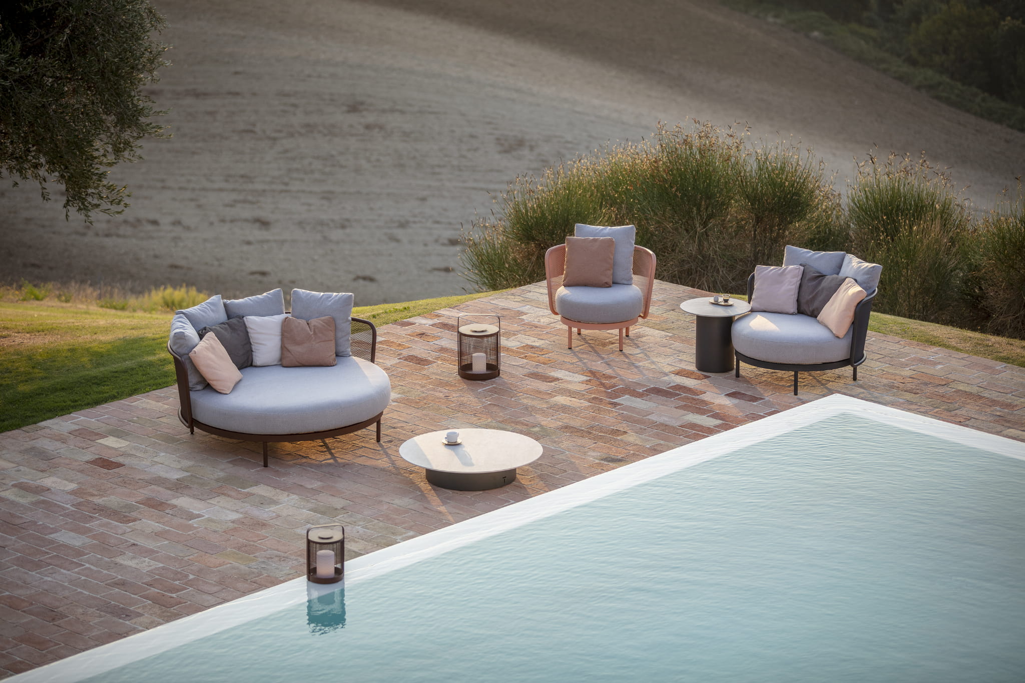 Tapicerka do wyboru w różnych kolorach wykonana z materiałów najwyższej jakości, które nie tracą koloru i są niezwykle przyjemne i miękkie w dotyku, niczym tapicerki mebli domowych, a przy tym odporne na działanie czynników atmosferycznych, szybkoschnące i plamoodporne.
