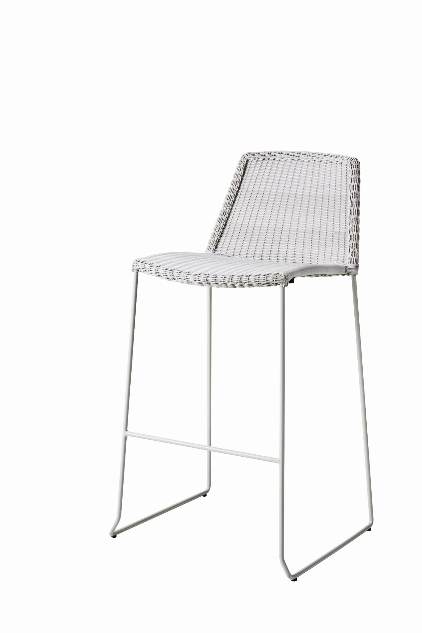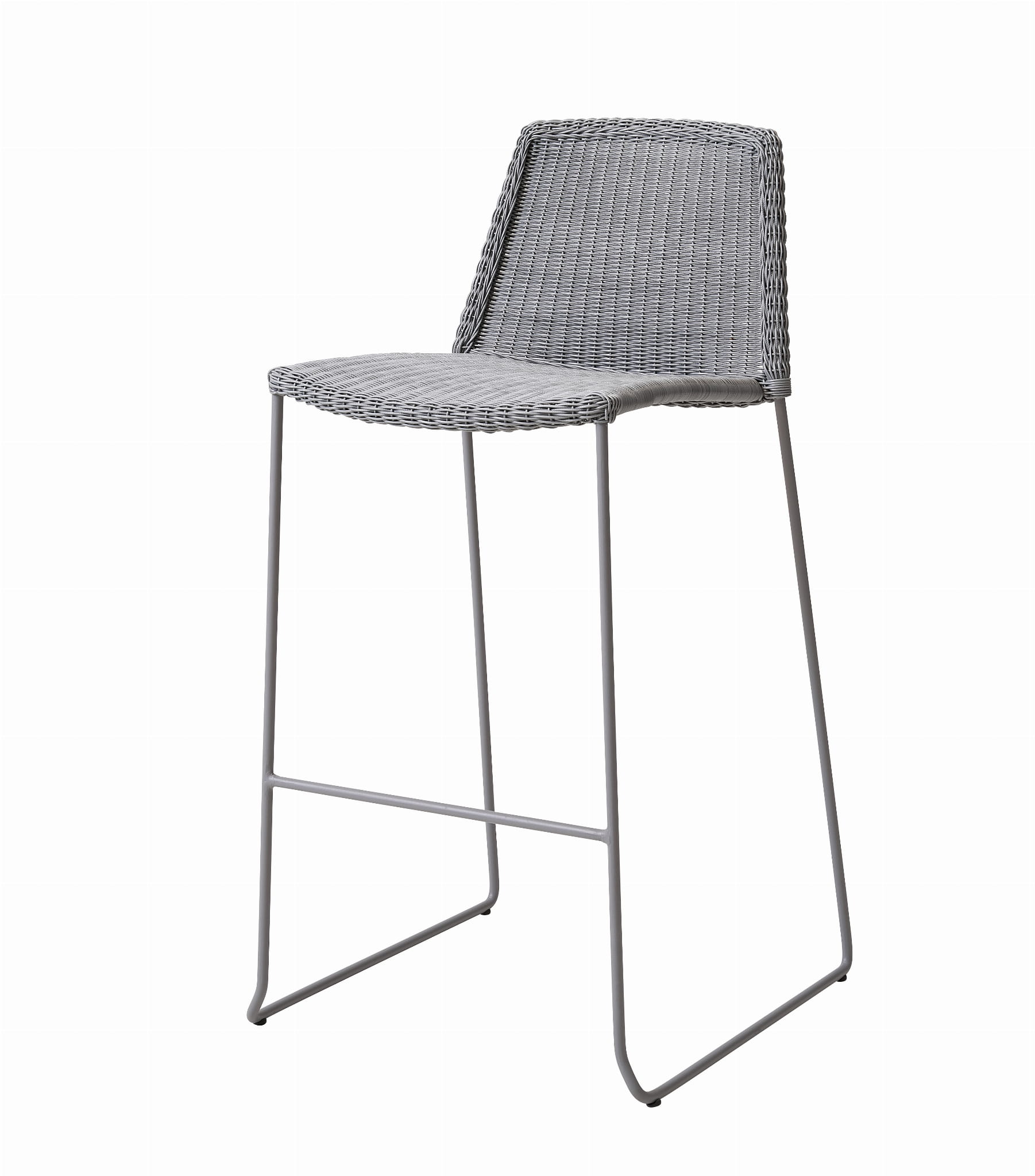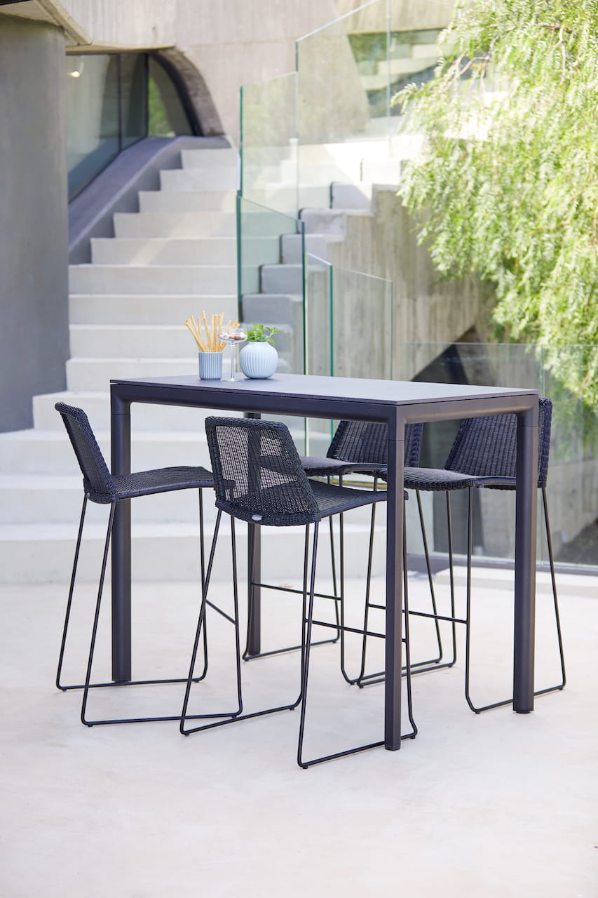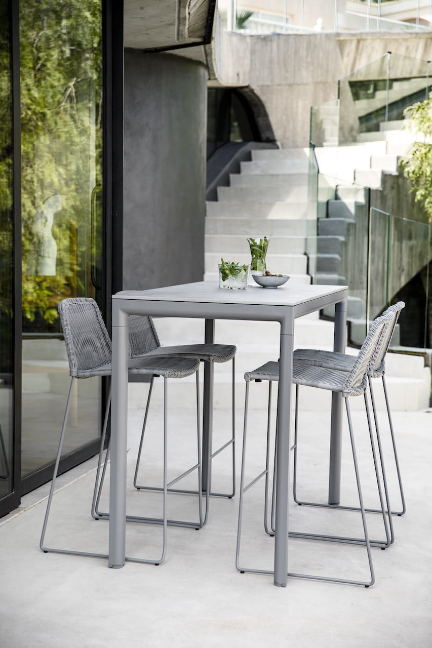 Wysokie krzesło barowe Breeze jest dostępne w kolorze czarnym, białym, taupe i jasnym szarym wykonane z materiału Cane-line Weave®, odpornego na warunki atmosferyczne i promienie UV.