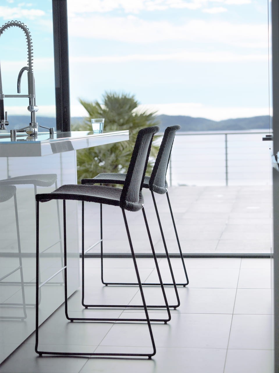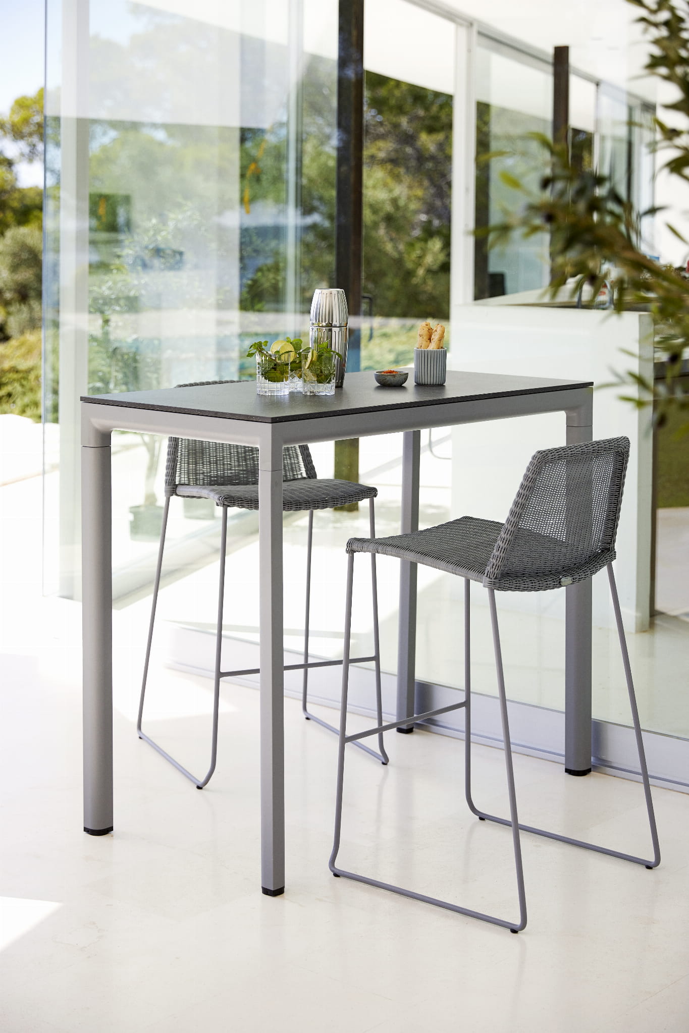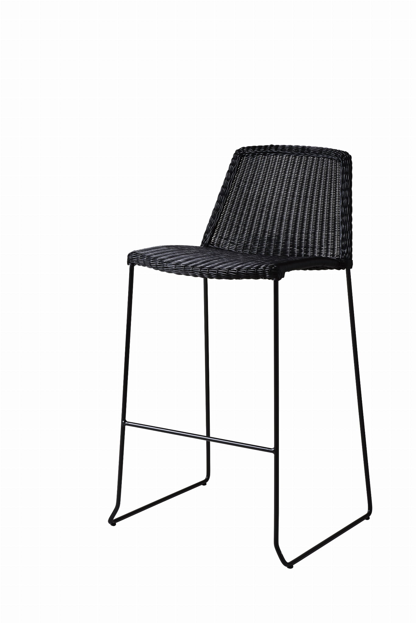 Wysokie krzesło barowe Breeze jest dostępne w kolorze czarnym, białym, taupe i jasnym szarym wykonane z materiału Cane-line Weave®, odpornego na warunki atmosferyczne i promienie UV.