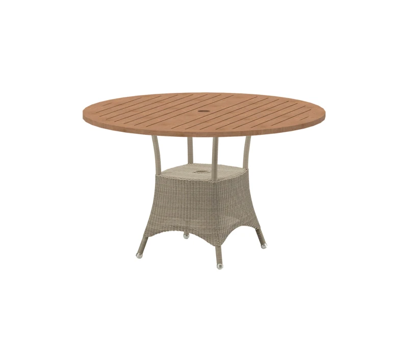 blat stołu wykonany jest z solidnego drewna teakowego, o średnicy 120 cm, który dodaje ciepłego melancholijnego blasku.