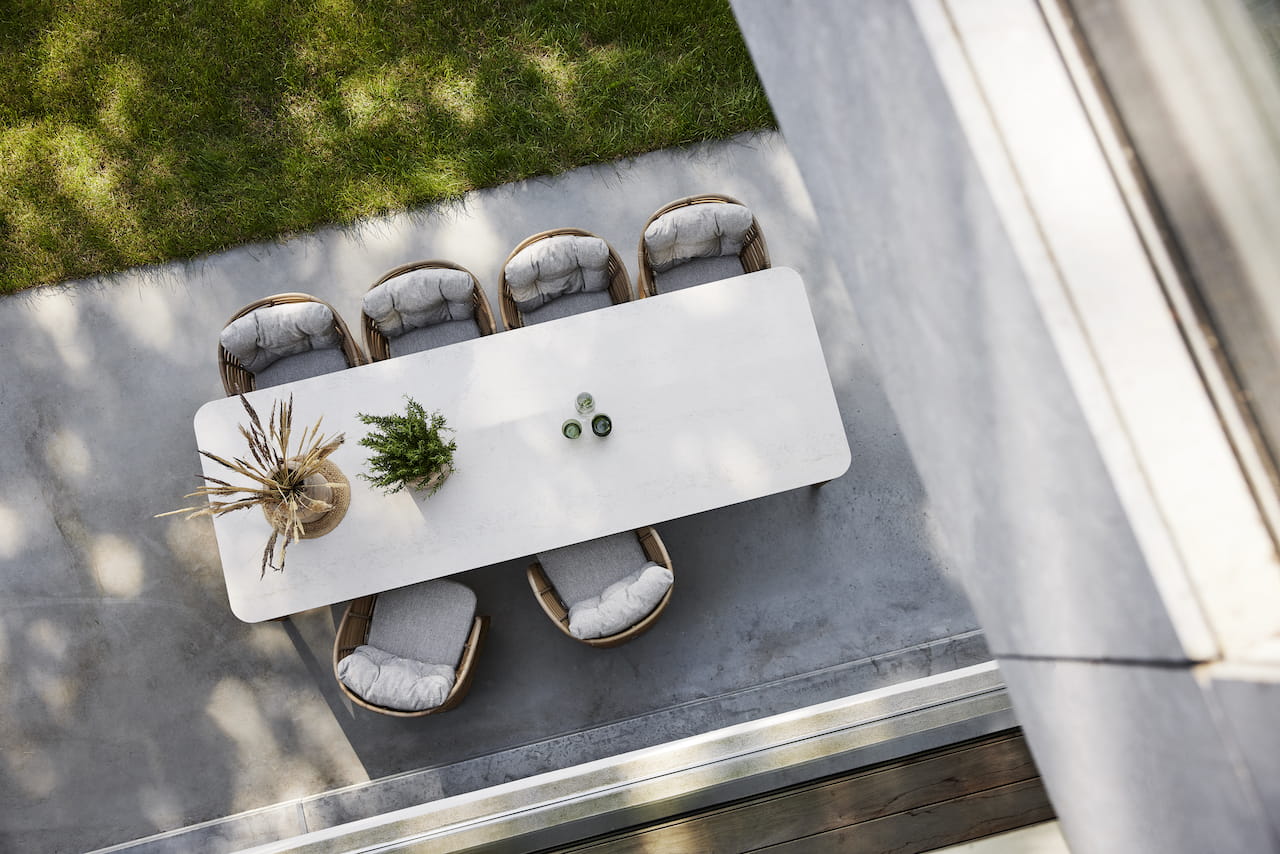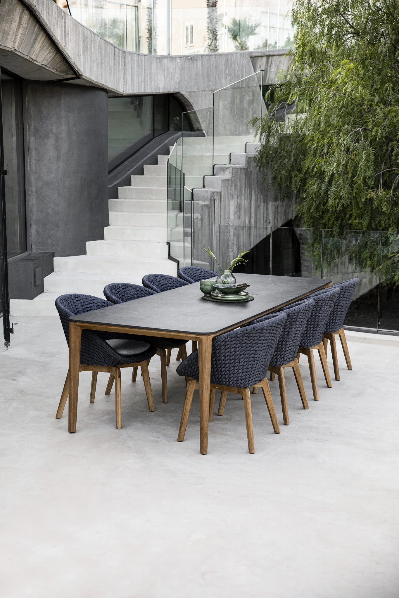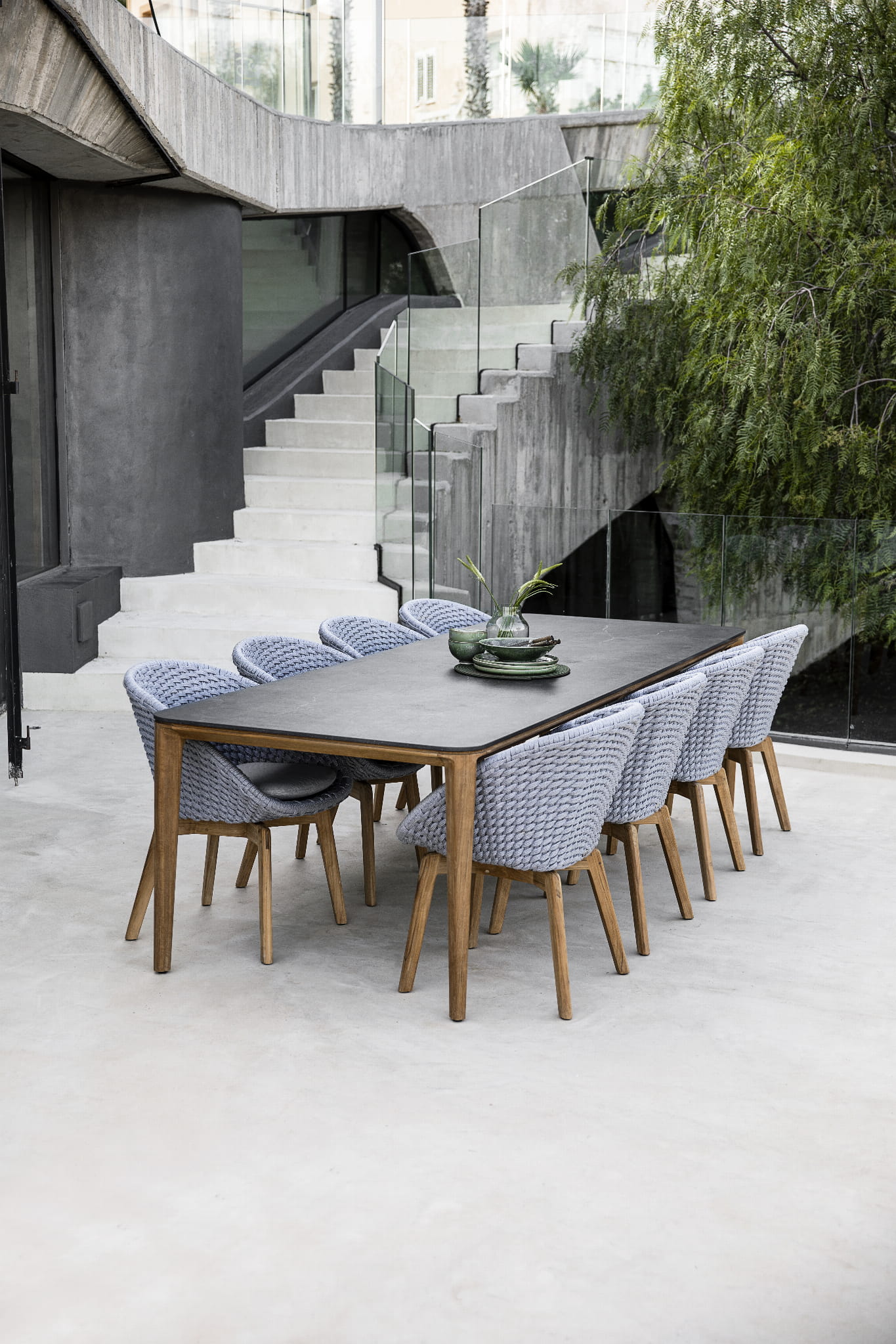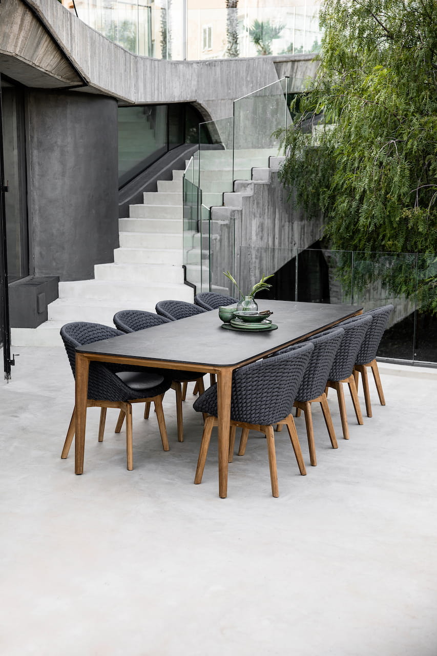 Połączenie drewna i ceramiki daje ekskluzywny i wyrafinowany wyraz, który na nowo definiuje jadalnię na świeżym powietrzu.