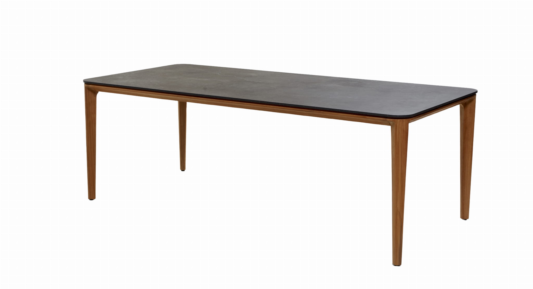 Ogrodowy stół obiadowy ASPECT łączy blask i ciepło drewna teakowego z czystą i solidną formą ceramicznego blatu.
