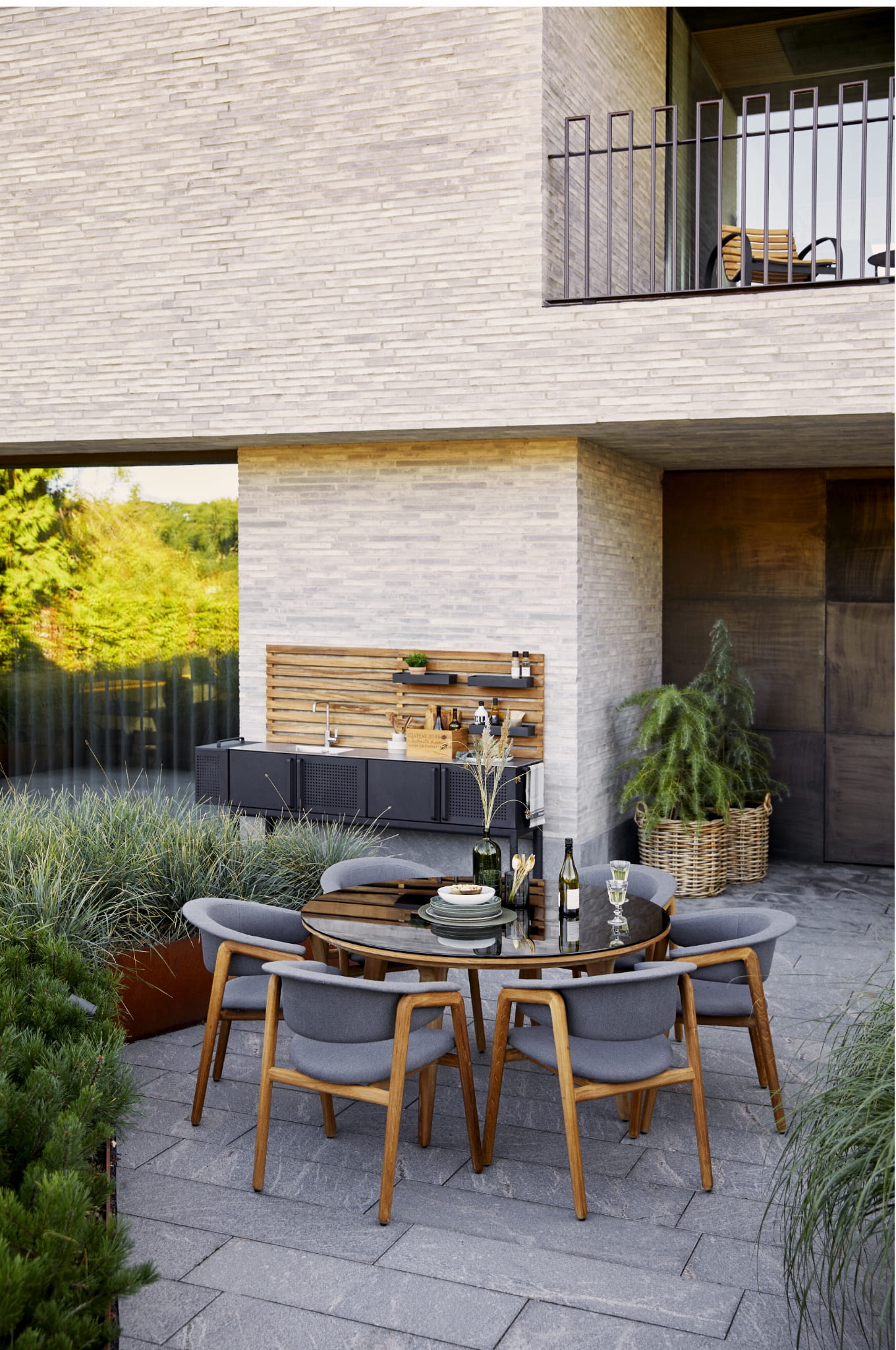 Połączenie drewna i ceramiki daje ekskluzywny i wyrafinowany wygląd, który na nowo definiuje jadalnię na świeżym powietrzu.