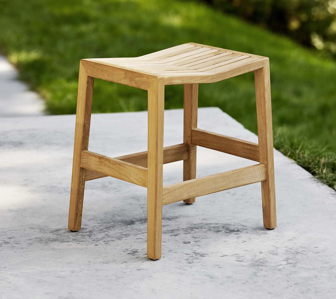 Drewno teakowe zapewnia ciepły błysk prostemu i eleganckiemu stołkowi.