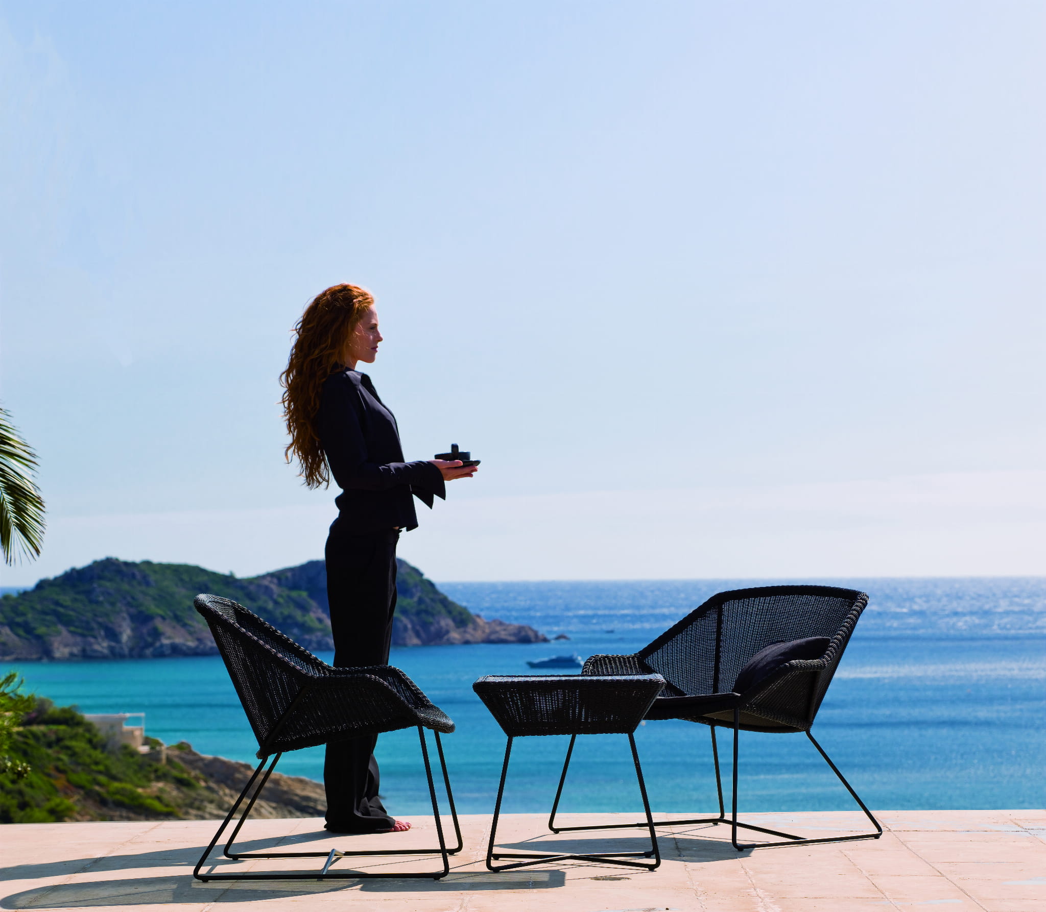 Ogrodowy stolik kawowy Breeze jest dostępny w kolorze czarnym wykonany z materiału Cane-line Weave® - odpornego na warunki atmosferyczne i słońce.