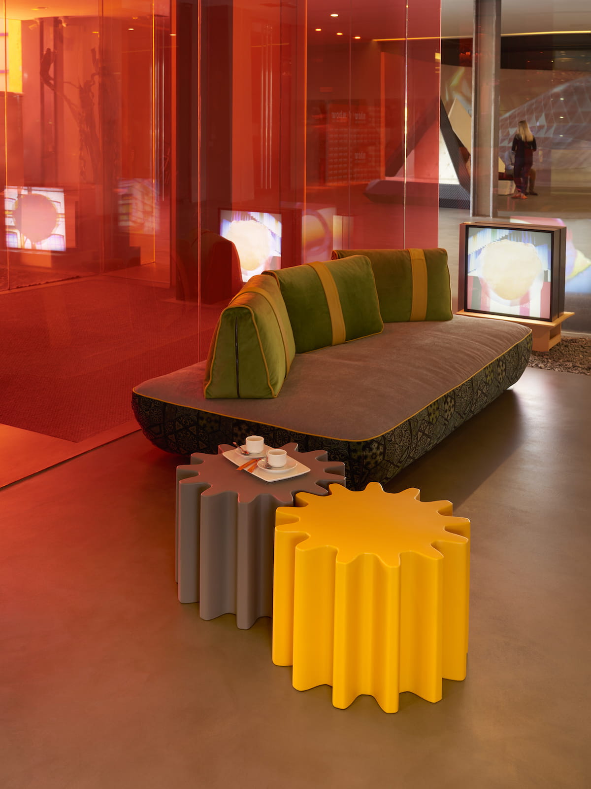 wiele stolików GEAR może być ustawionych ze sobą, niczym prawdziwy mechanizm zegara, dzięki szerokiemu wachlarzowi kolorów