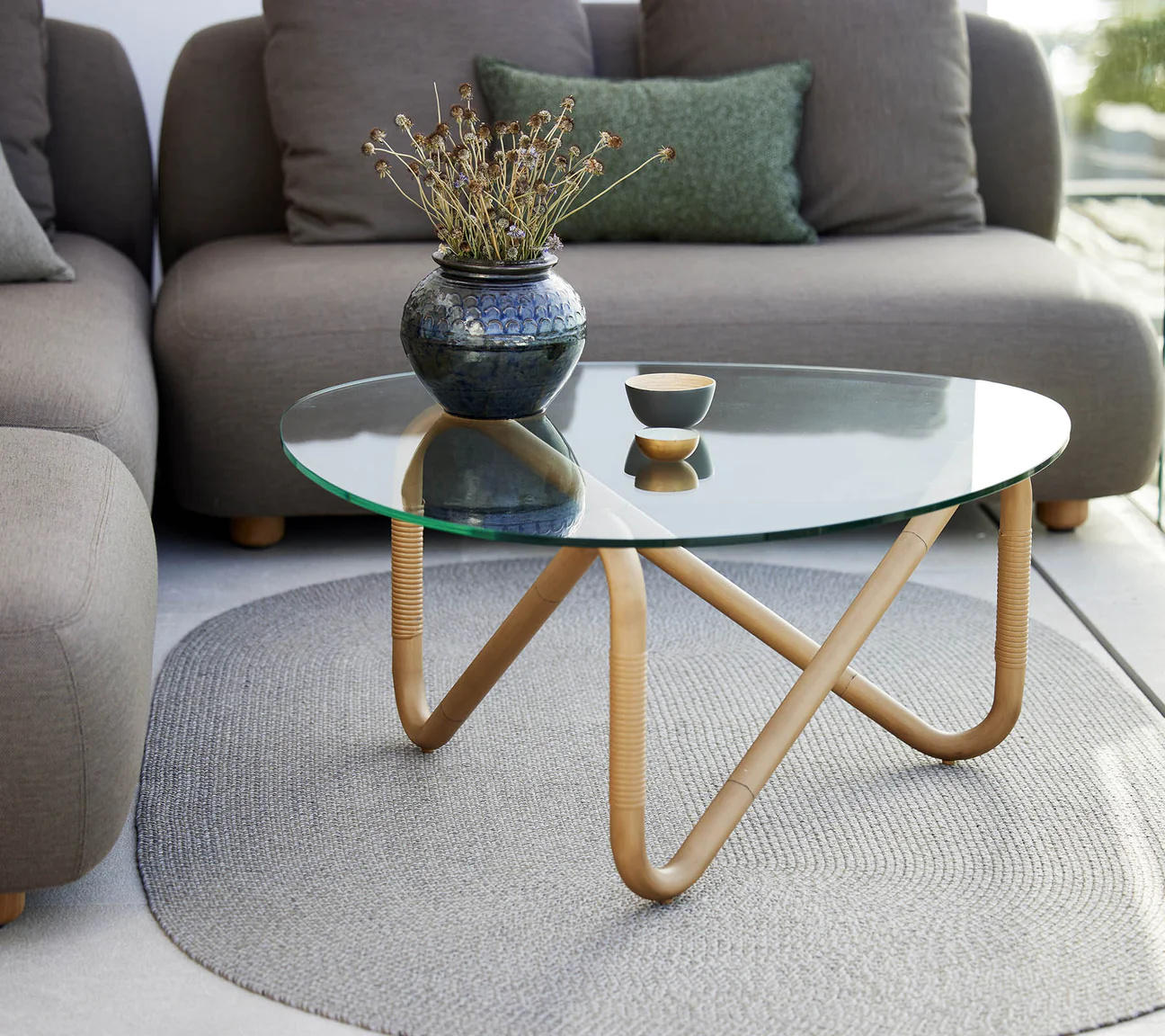 Podstawa stołu ma zakrzywiony i rzeźbiony kształt, dzięki czemu jest lekka i przezroczysta. Podstawa Wave jest wykonana z aluminium w kolorze rattanu. Blat stołu wykonany jest ze szkła hartowanego, około