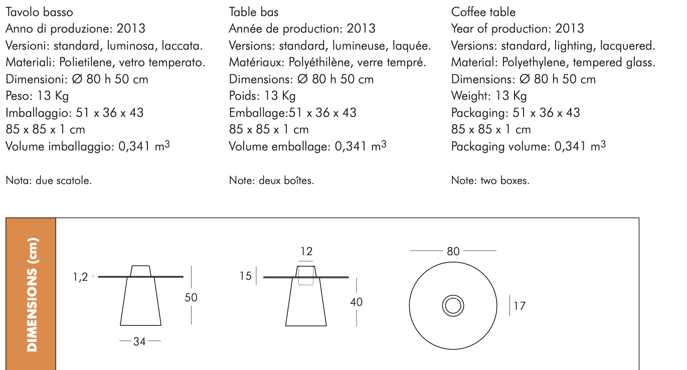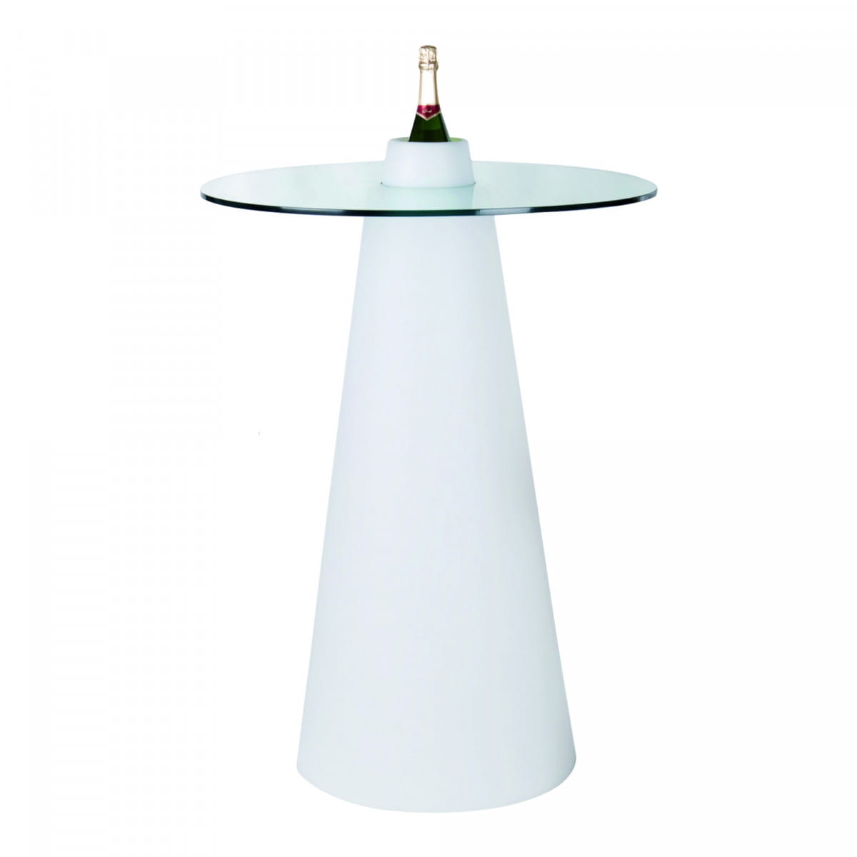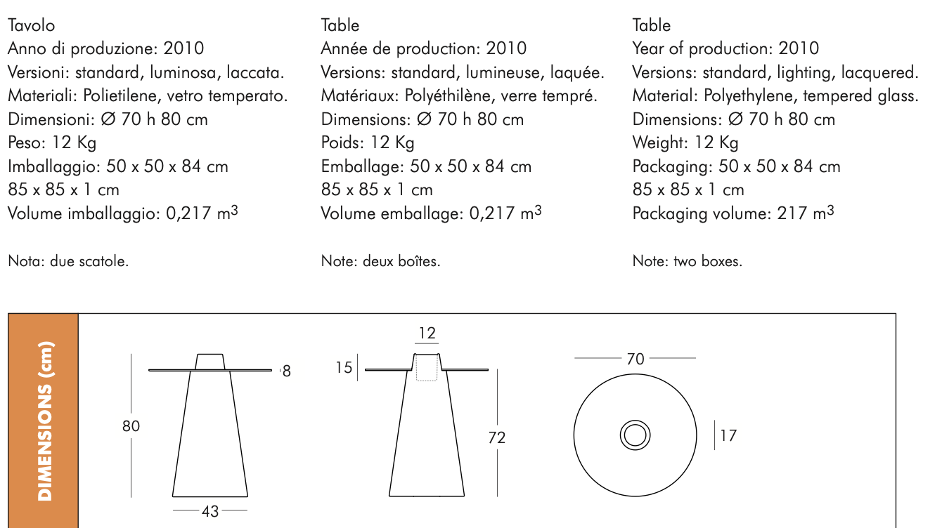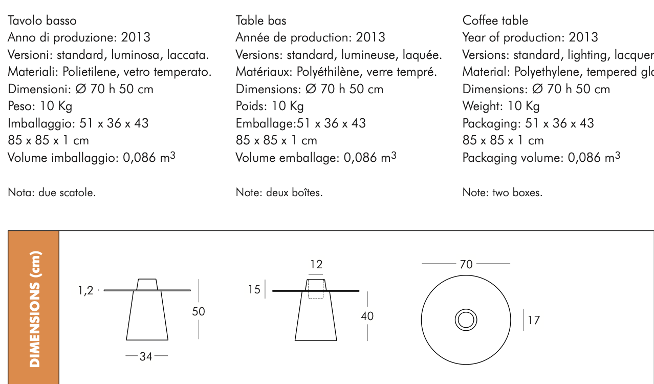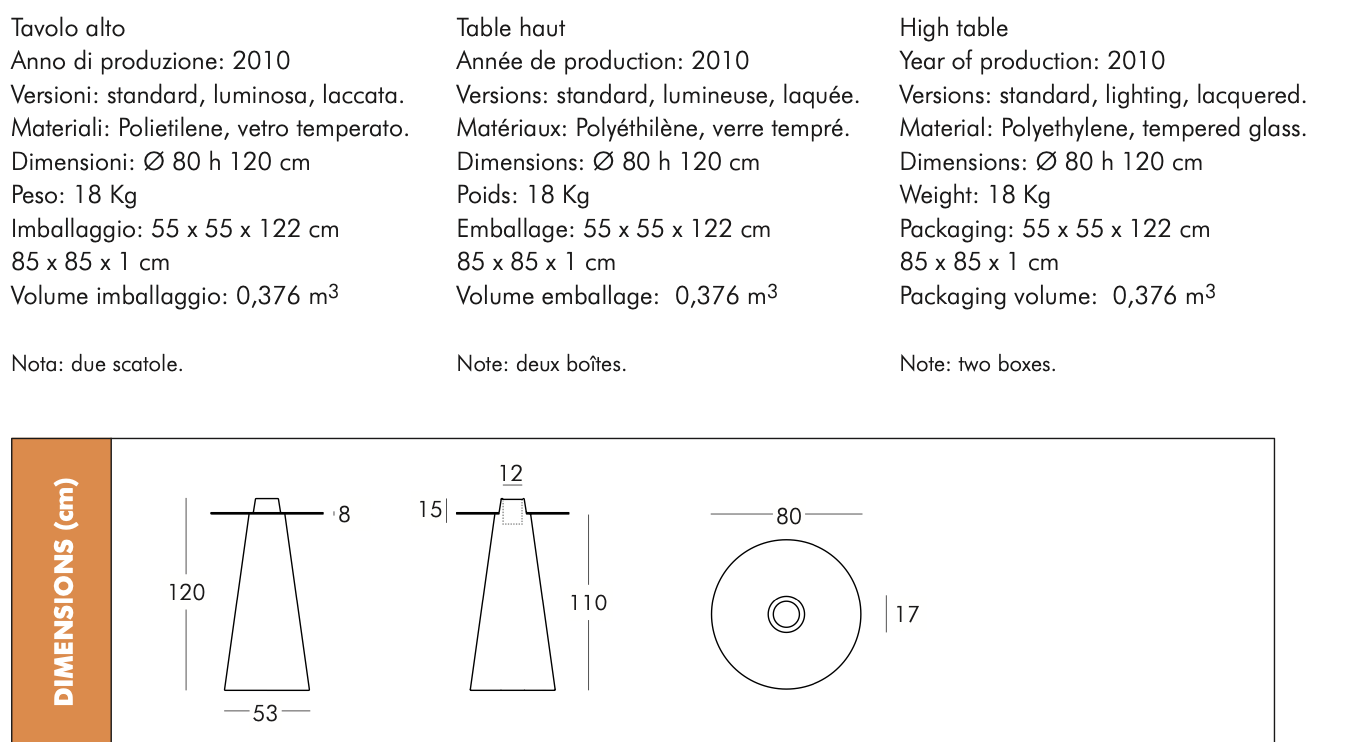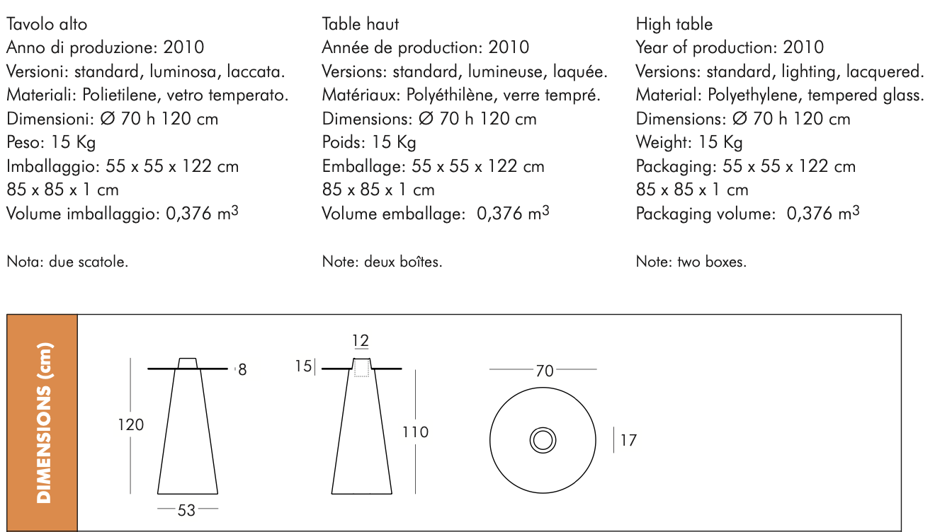 to liniowy design: w formie stożka wykonanym z polietylenu, z okrągłym (lub kwadratowym - oddzielny produkt) blatem, z hartowanego szkła, w różnych wymiarach.