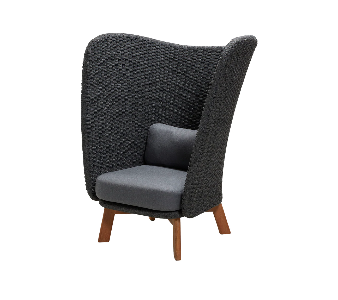 Ogrodowy wysoki fotel wypoczynkowy, posiada nogi stworzone z drewna teak, i siedzisko z cane-line soft rope®, co czyni je komfortowe i wytrzymałym