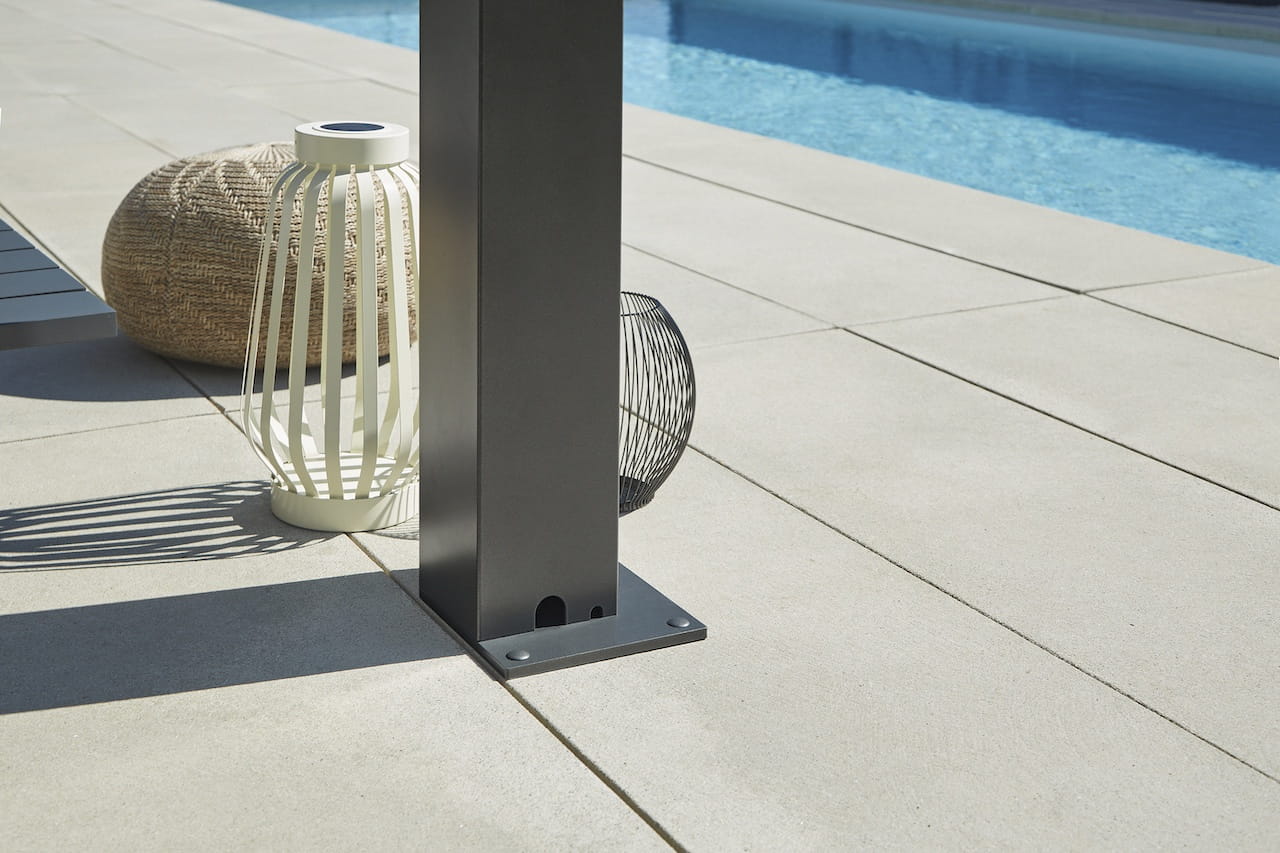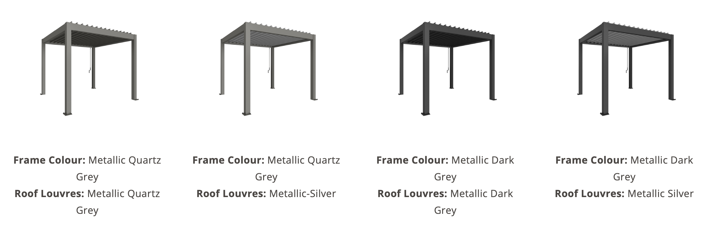 Pergola występuje w 2 kolorach ramy (ciemny szary i kwarcowy szary) oraz 2 kolorach lameli (ciemny szary i srebrny).