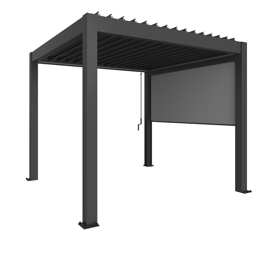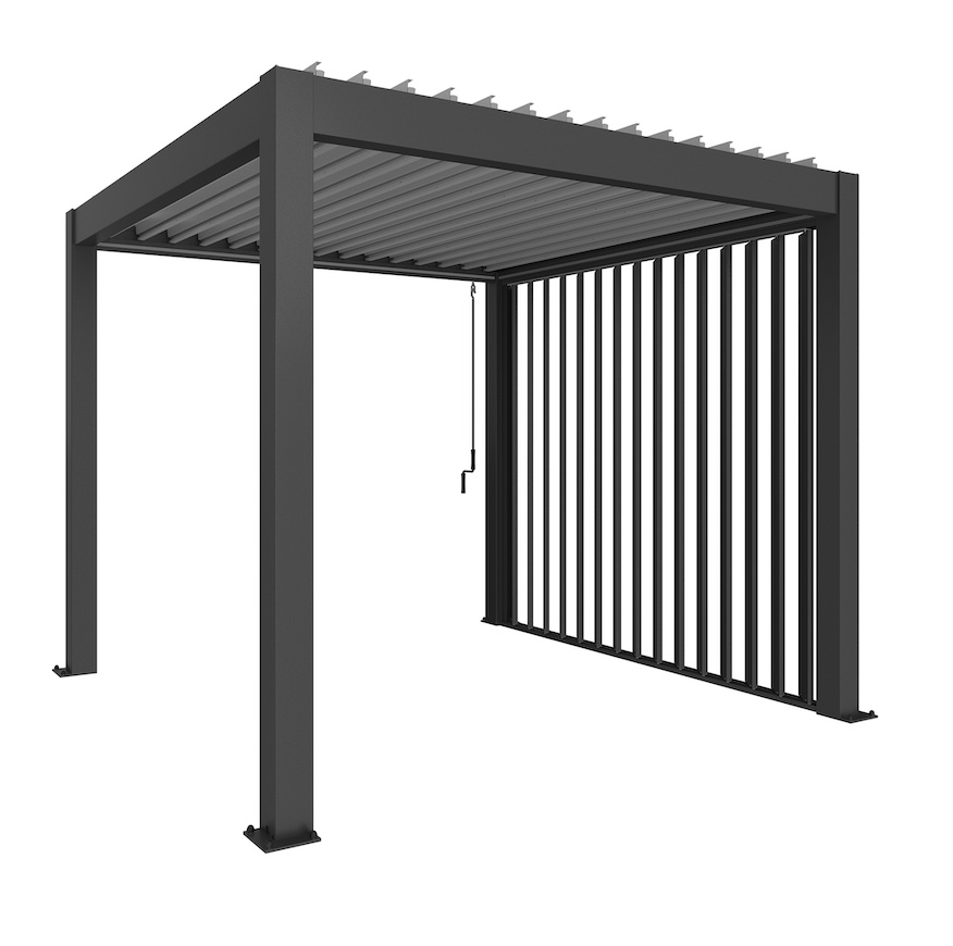 Uwaga techniczna - w przypadku pergoli z opcją ręcznego składania dachu montaż rolety przeciwsłonecznej i bocznej ściany z lameli nie jest możliwy na ścianie, gdzie znajduje się korba ręcznego sterowania.