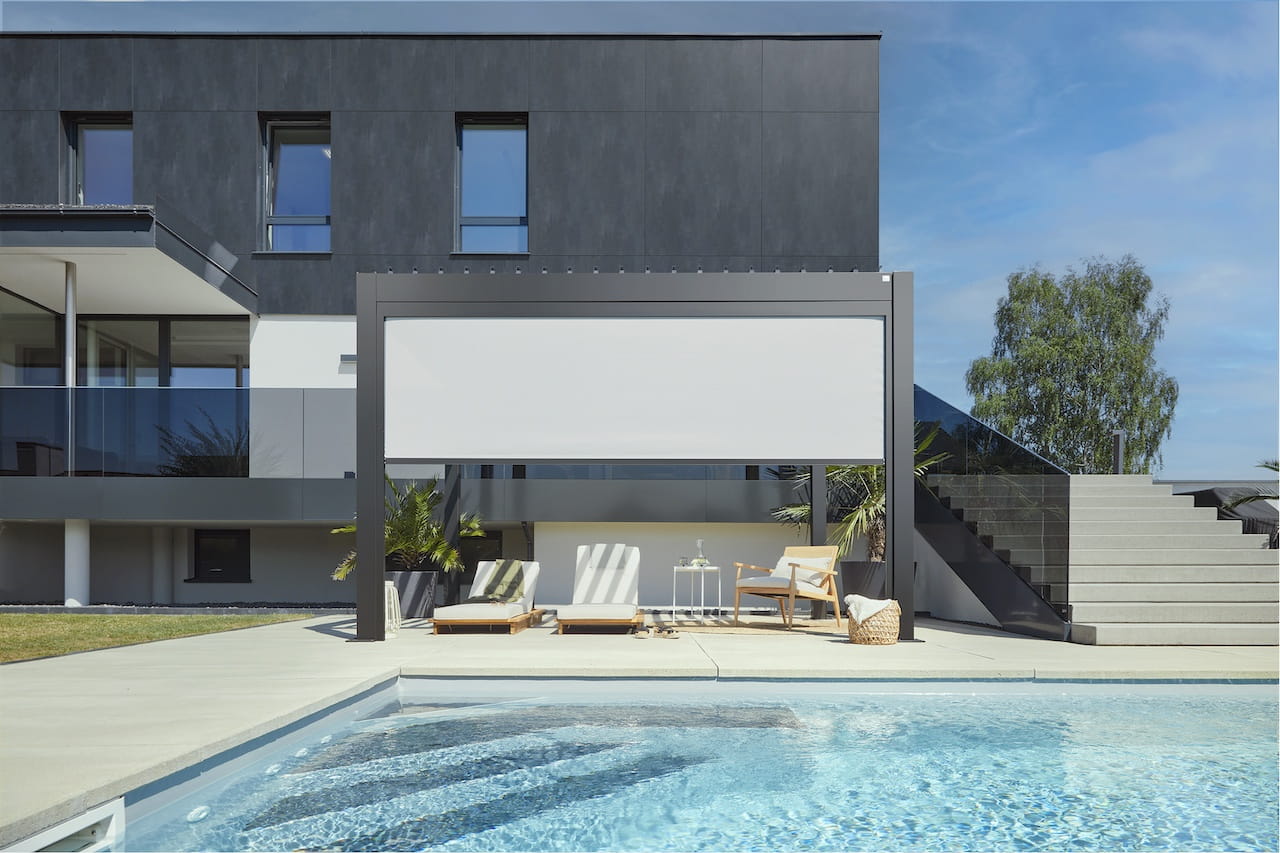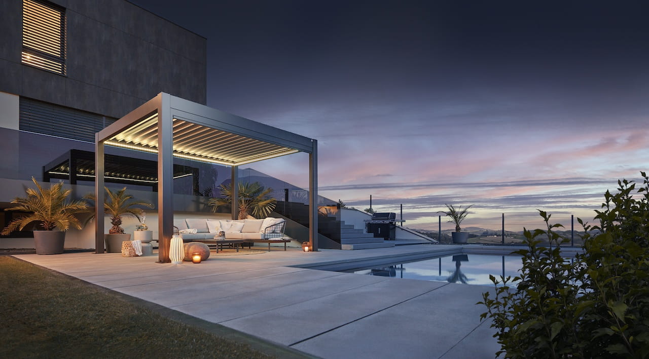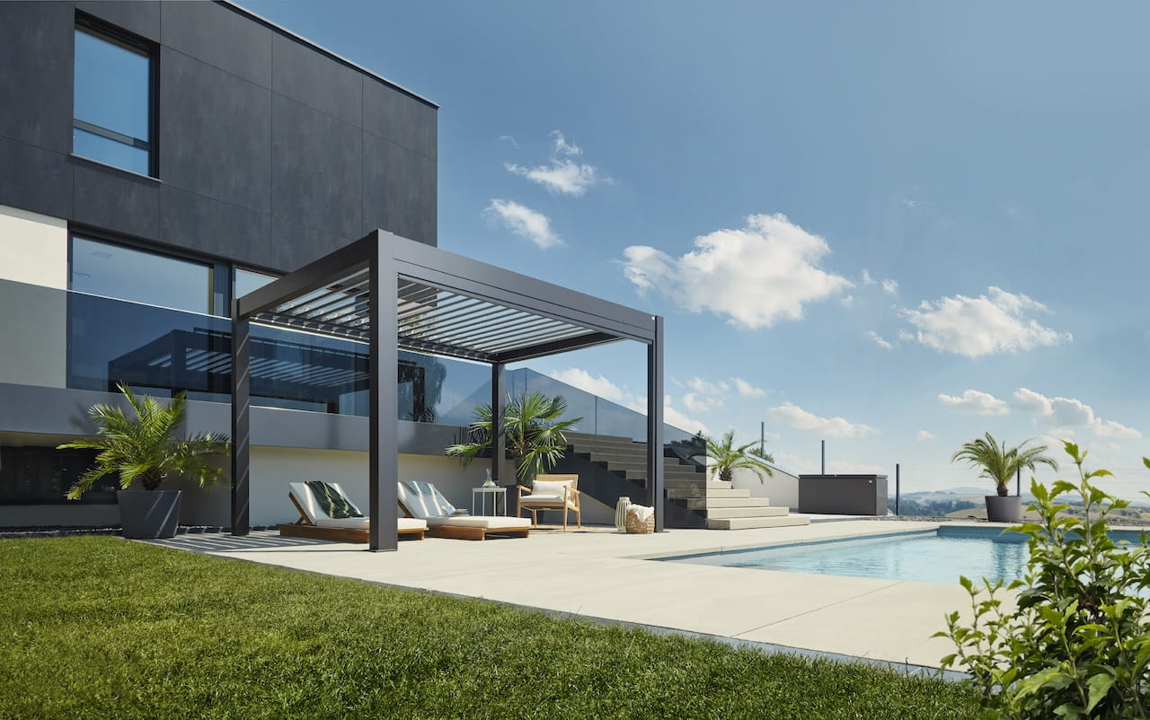 Nowoczesny płaski dach w formie ruchomych lameli sprawiają, że pergola przyciąga wszystkie spojrzenia stając się prawdziwą ozdobą w ogrodzie, a przy tym świetnie spełnia swoja funkcję.
