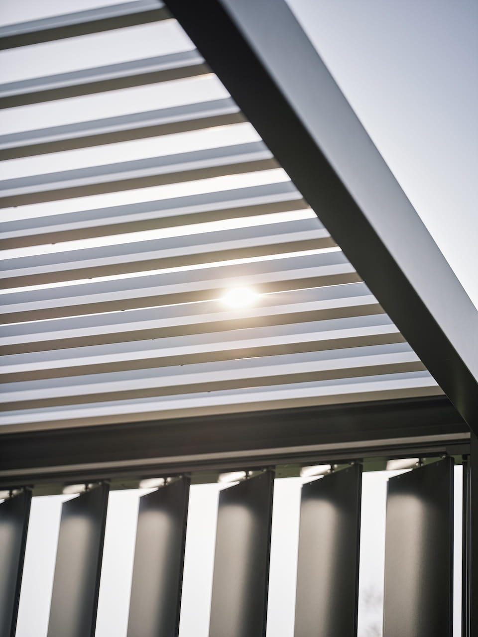 Lamele dachu pergoli mogą być regulowane ręcznie lub opcjonalnie za pomocą silnika elektrycznego.