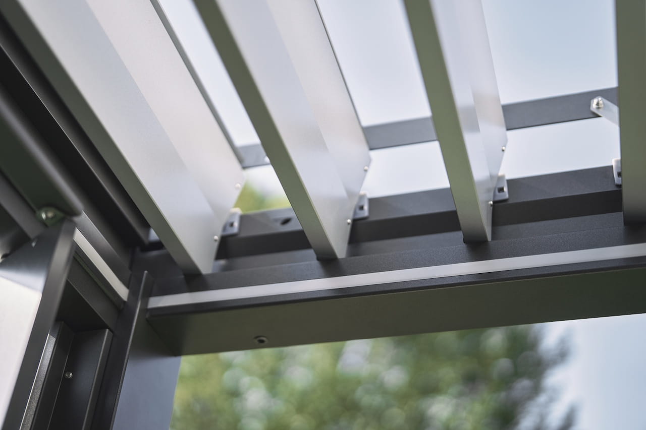 Co istotne, lamele dachu pergoli są wypełnione we wnętrzu co zapobiega uciążliwemu odgłosowi np. spadających kropel deszczu na dach pergoli.