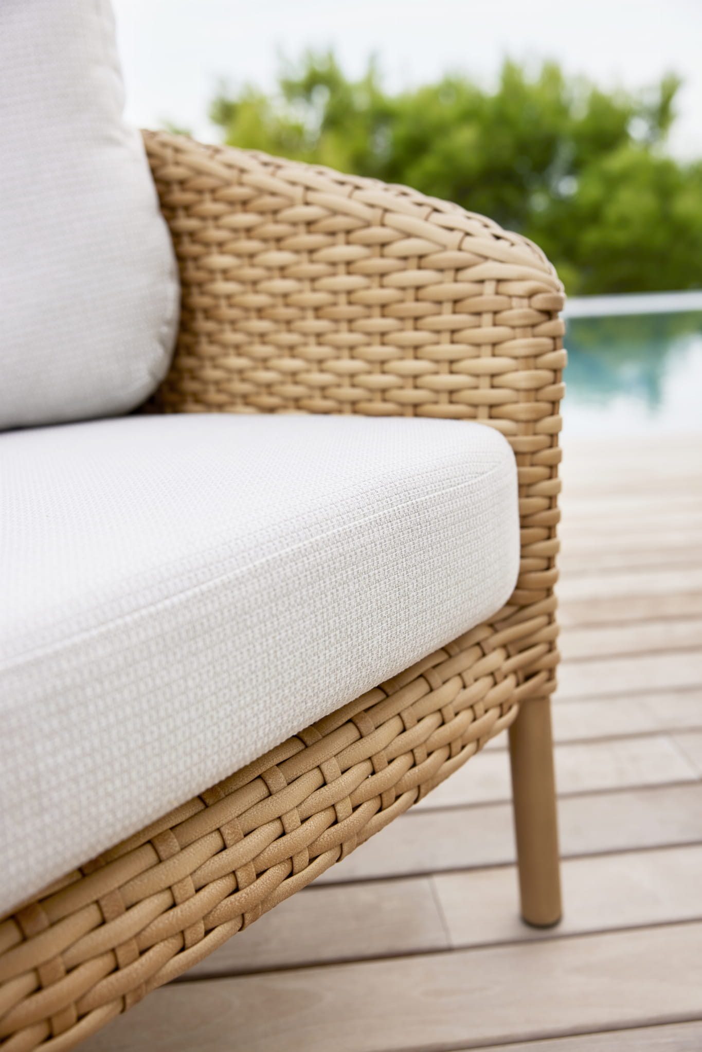 Elegancko skonstruowana sofa wypoczynkowa wykonana jest z wytrzymałych na warunki atmosferyczne materiałów Cane-line. Wyposażona w wygodne i niezwykle miękkie poduszki, które nadają jej