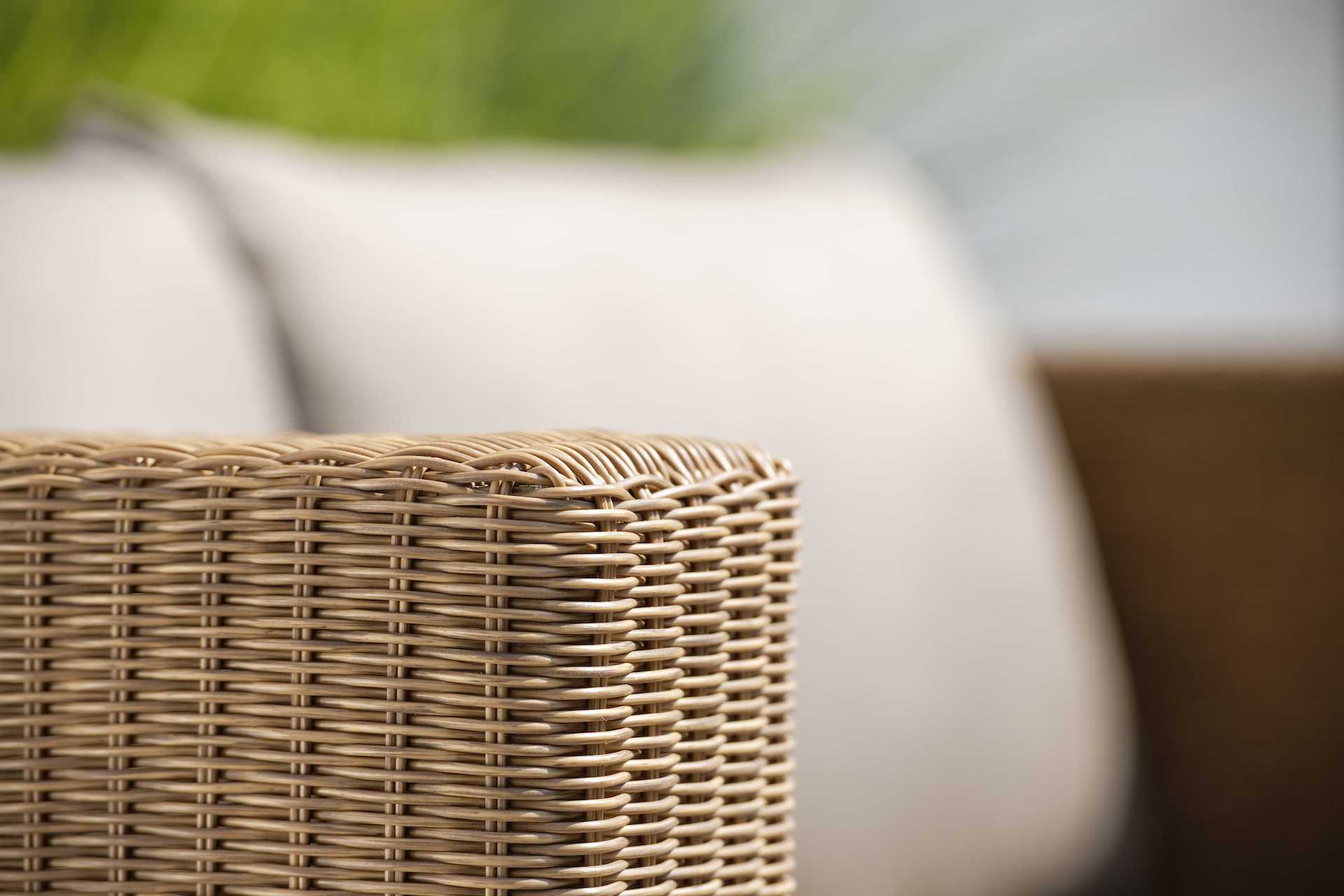 Ręczne oplatanie na solidnych, malowanych proszkowo aluminiowych ramach sprawia, że te meble ogrodowe są trwałe i unikalne.