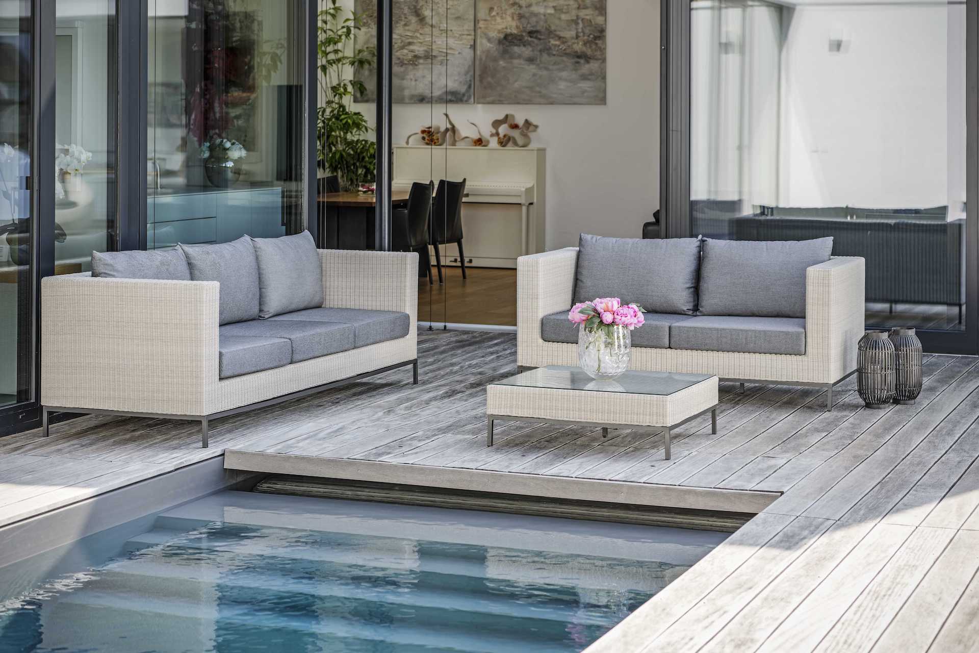Ręczne oplatanie na solidnych, malowanych proszkowo aluminiowych ramach sprawia, że te meble ogrodowe są trwałe i unikalne.