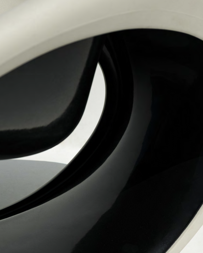 Bryła jest wydrążona i prowokacyjnie prezentuje swoje wnętrze, wykończona w kolorze czerwonym lub czarnym.