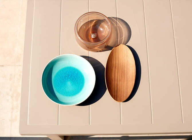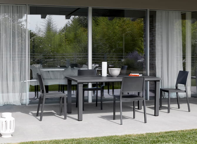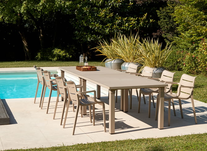 ERCOLE to ogrodowy stół, stworzony z technopolimeru, którego blat posiada wzór listew ułożonych obok siebie, co dodaje mu elegancji.