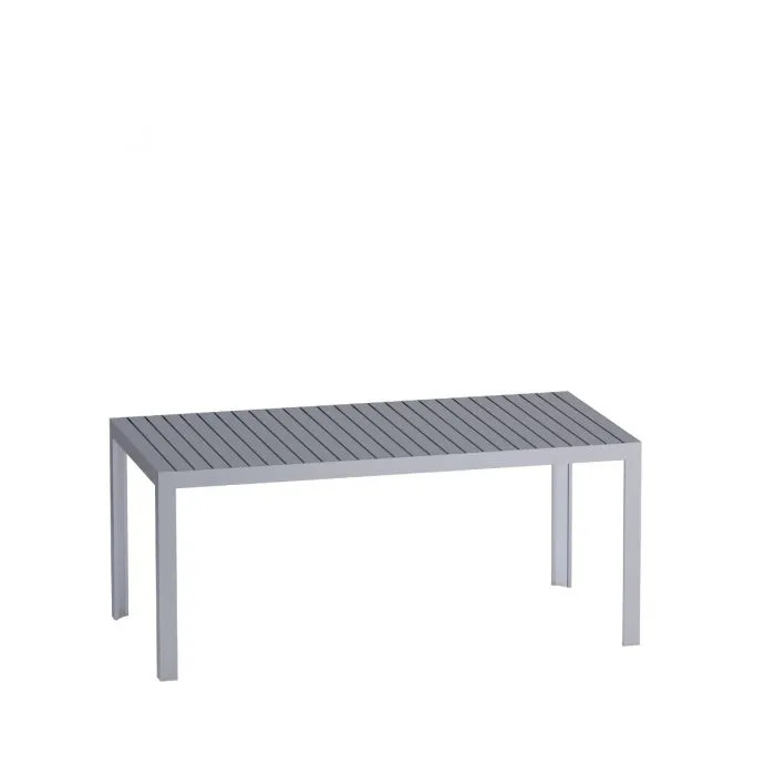 Aluminiowy stół z blatem w formie listewek, ekologiczny i wyprodukowany z wytrzymałych materiałów przeznaczonych na zewnątrz.