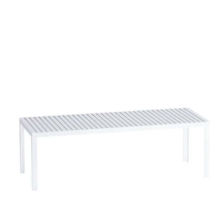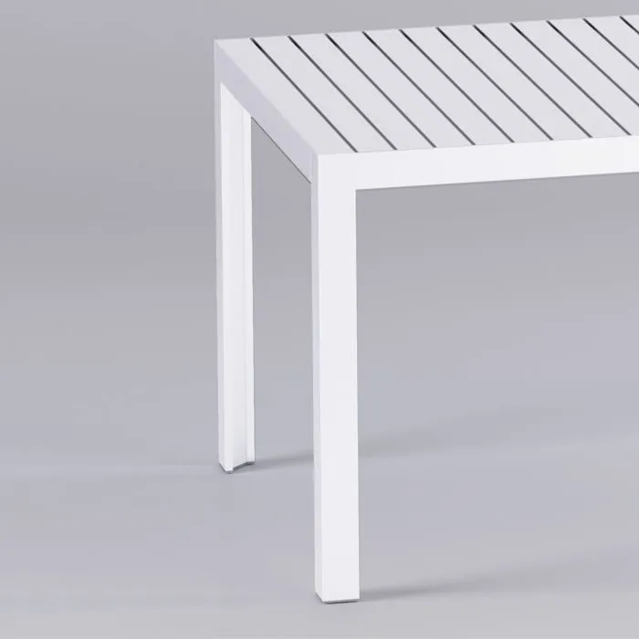 Aluminiowy stół z blatem w formie listewek, ekologiczny i wyprodukowany z wytrzymałych materiałów przeznaczonych na zewnątrz.