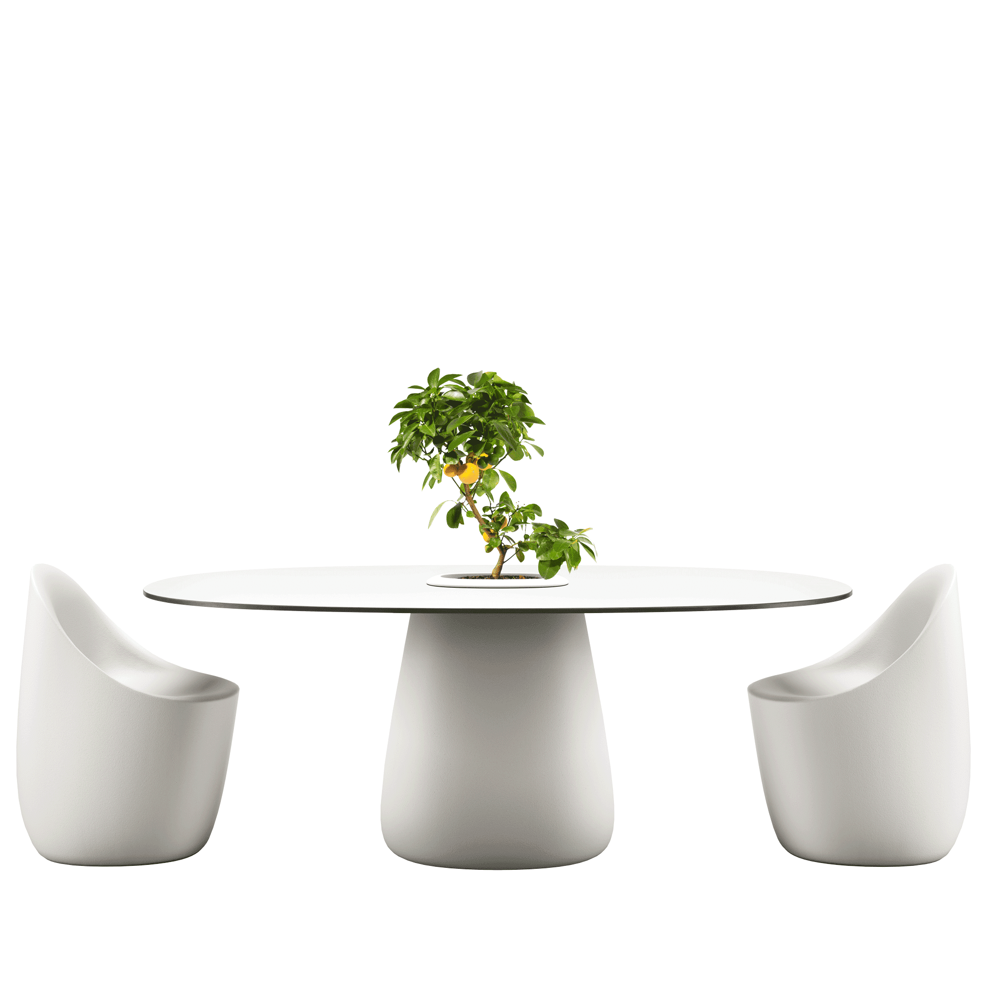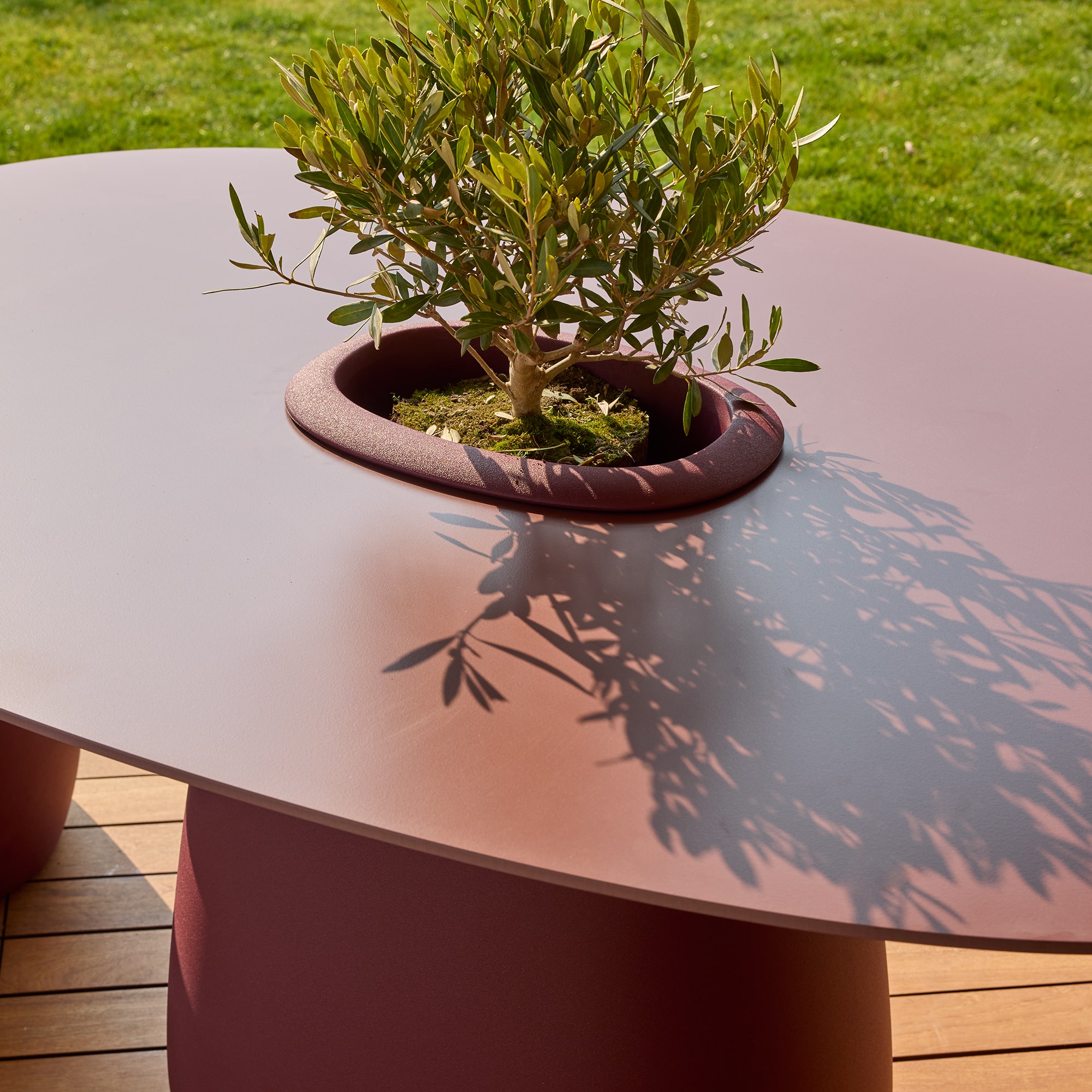 Stół ogrodowy COBBLE zaprojektowany przez Elisę Giovannoni charakteryzuje się centralną podstawą oraz solidnym, owalnym blatem wykonanym z trwałego HPL.