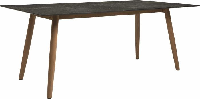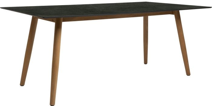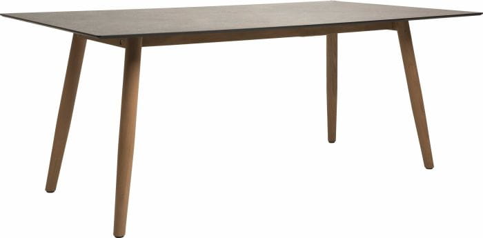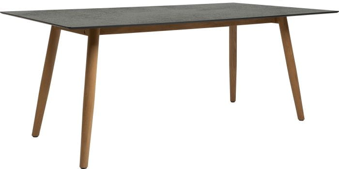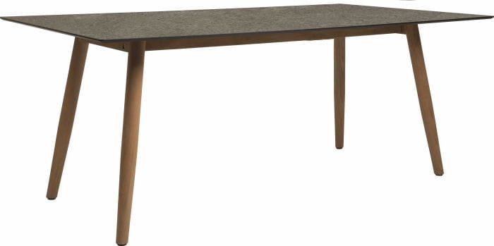 Ta wersja stołu posiada nogi wykonane z drewna teak, co dodaje mu ciepłego charakteru.