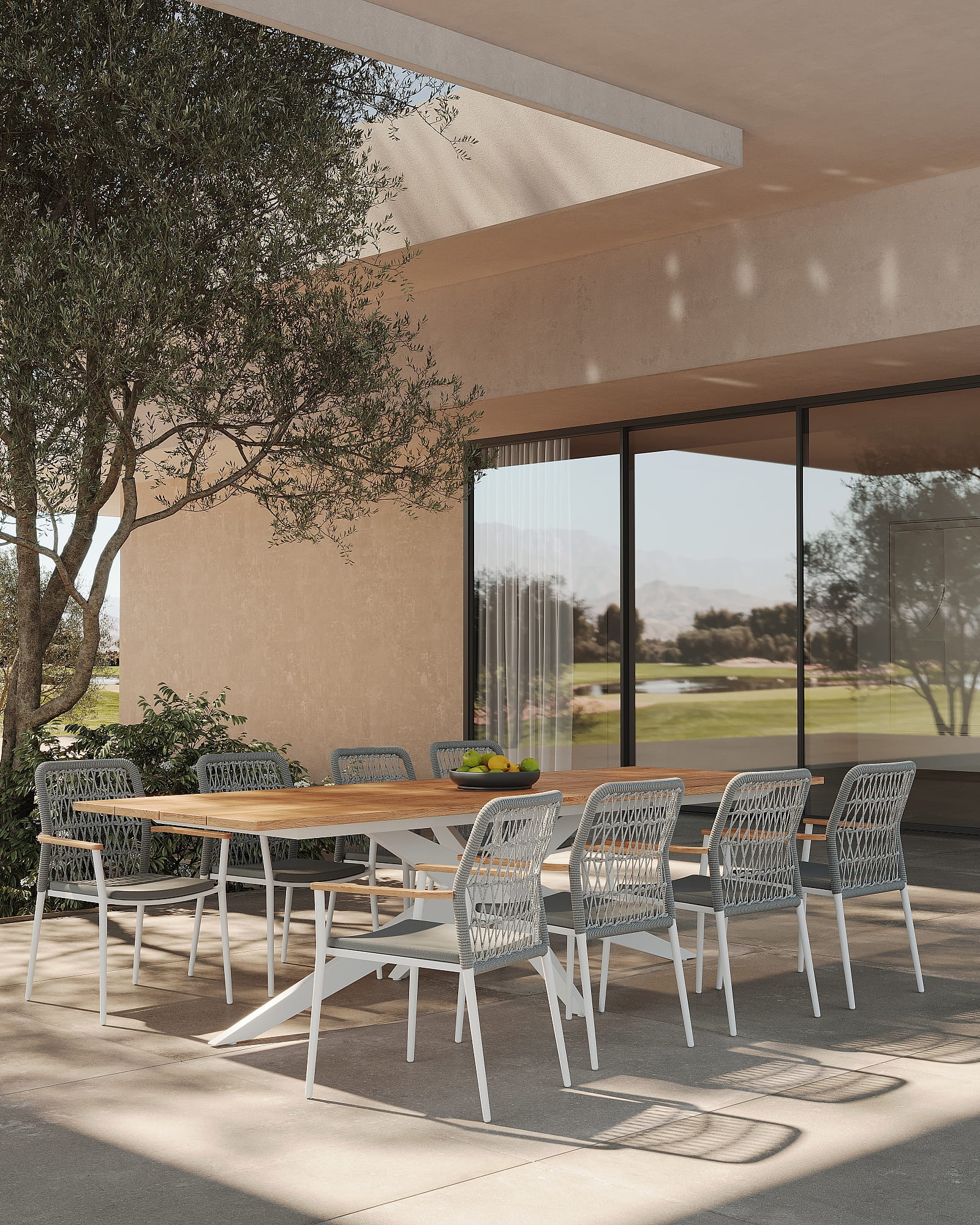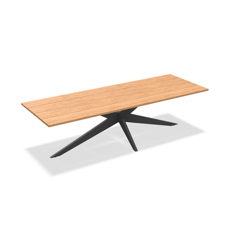 Każdy element jest wykonany z gładkiego blatu z drewna tekowego lub ceramicznego klasy A, połączonego z aluminiową ramą ze skrzyżowanymi nogami, która jest dostępna w kolorze czarnym matowym,