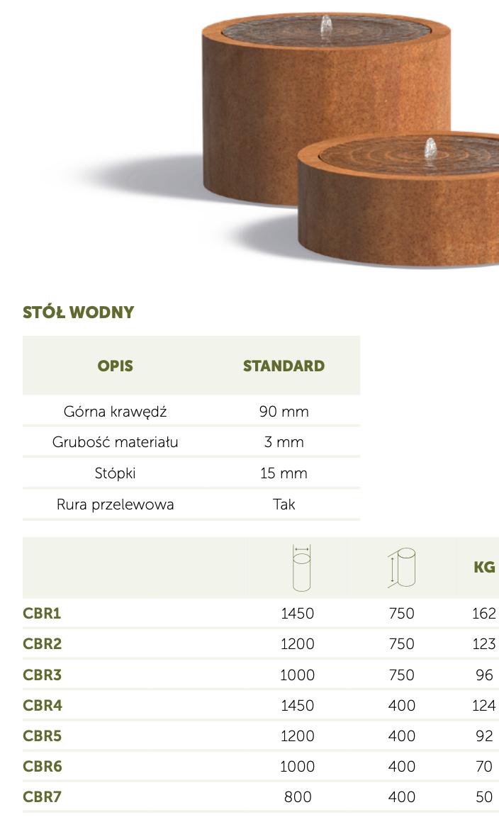 Stoły wodne występują w średnicach 80, 100, 120 i 145 cm oraz wysokości 40 i 75 cm.