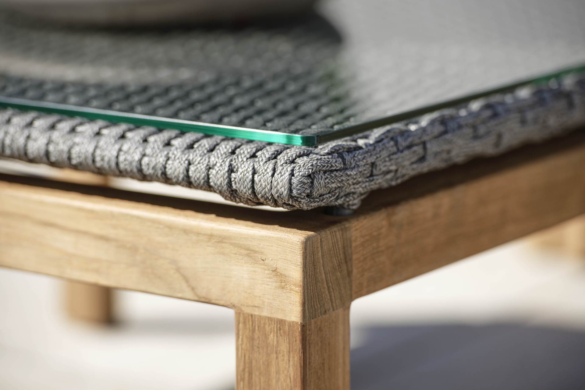 Stolik kawowy LEAH posiada stabilną, drewnianą ramę i plecioną podstawę z syntetycznego sznurka w kolorze szarym.