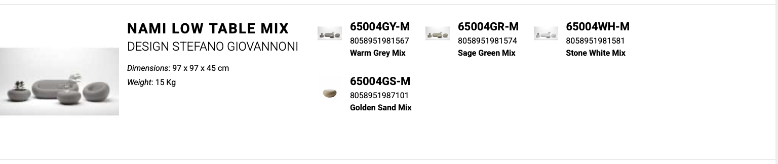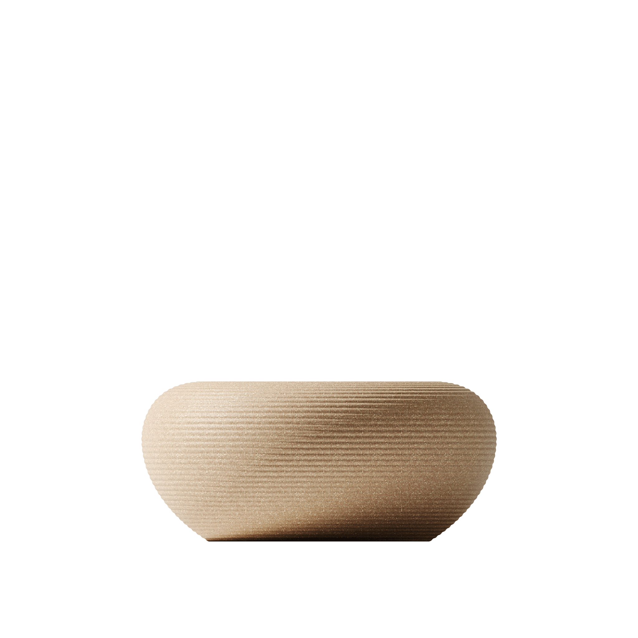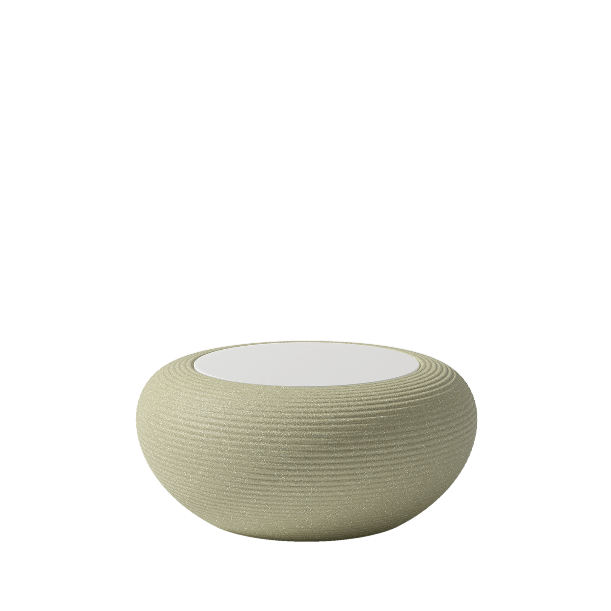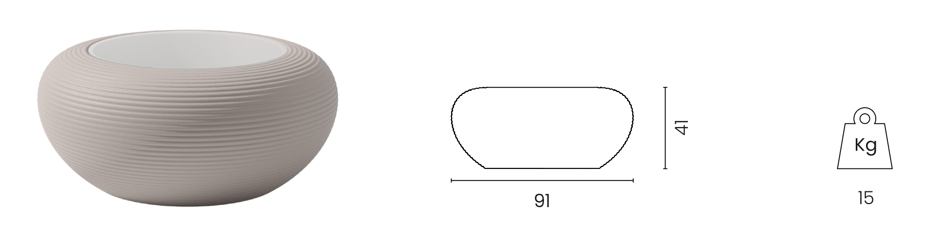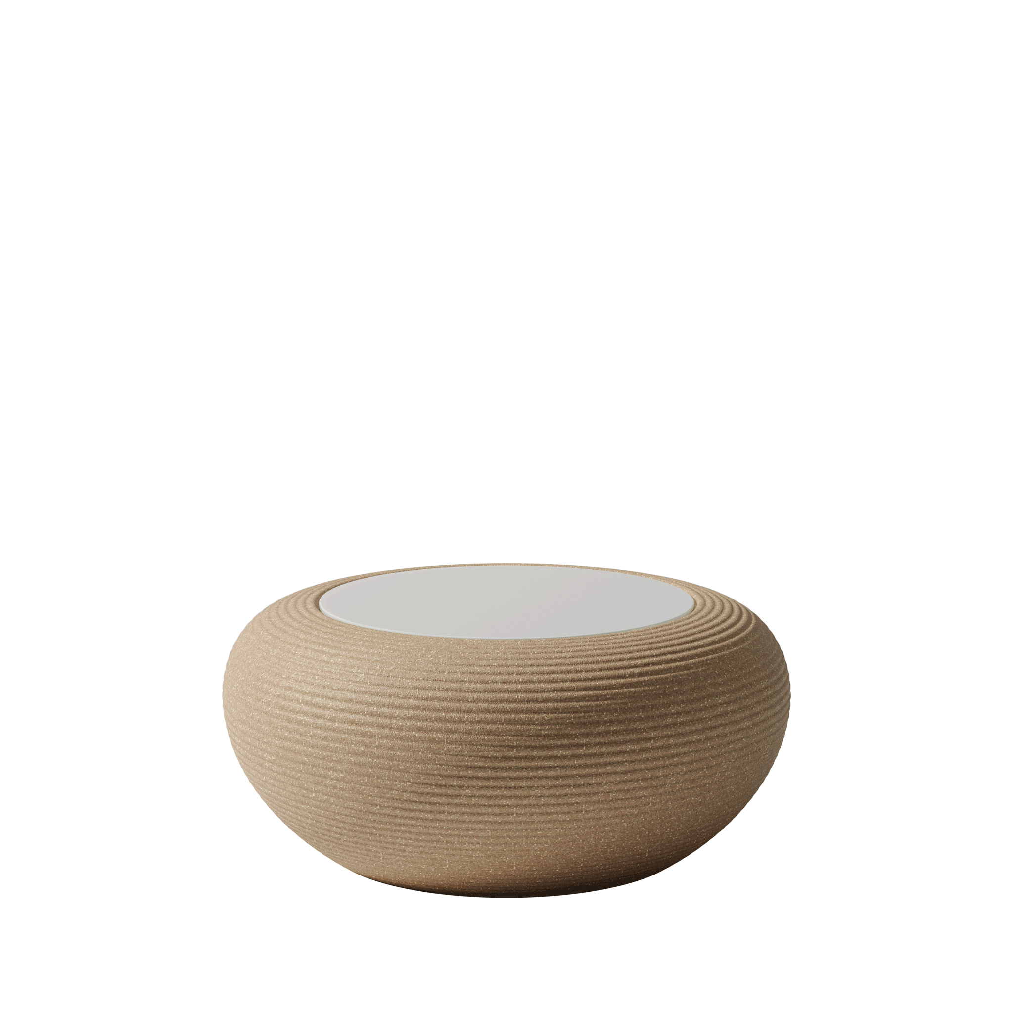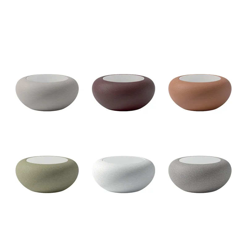 Stolik NAMI mix powstaje w wyniku rotacyjnego obrotu sekcji wokół przekątnej. Dzięki temu ma idealnie okrągły kształt, a żłobienia charakteryzujące jego powierzchnię rozchodzą się od środka do krawędzi tworząc sekwencję koncentrycznych pierścieni.