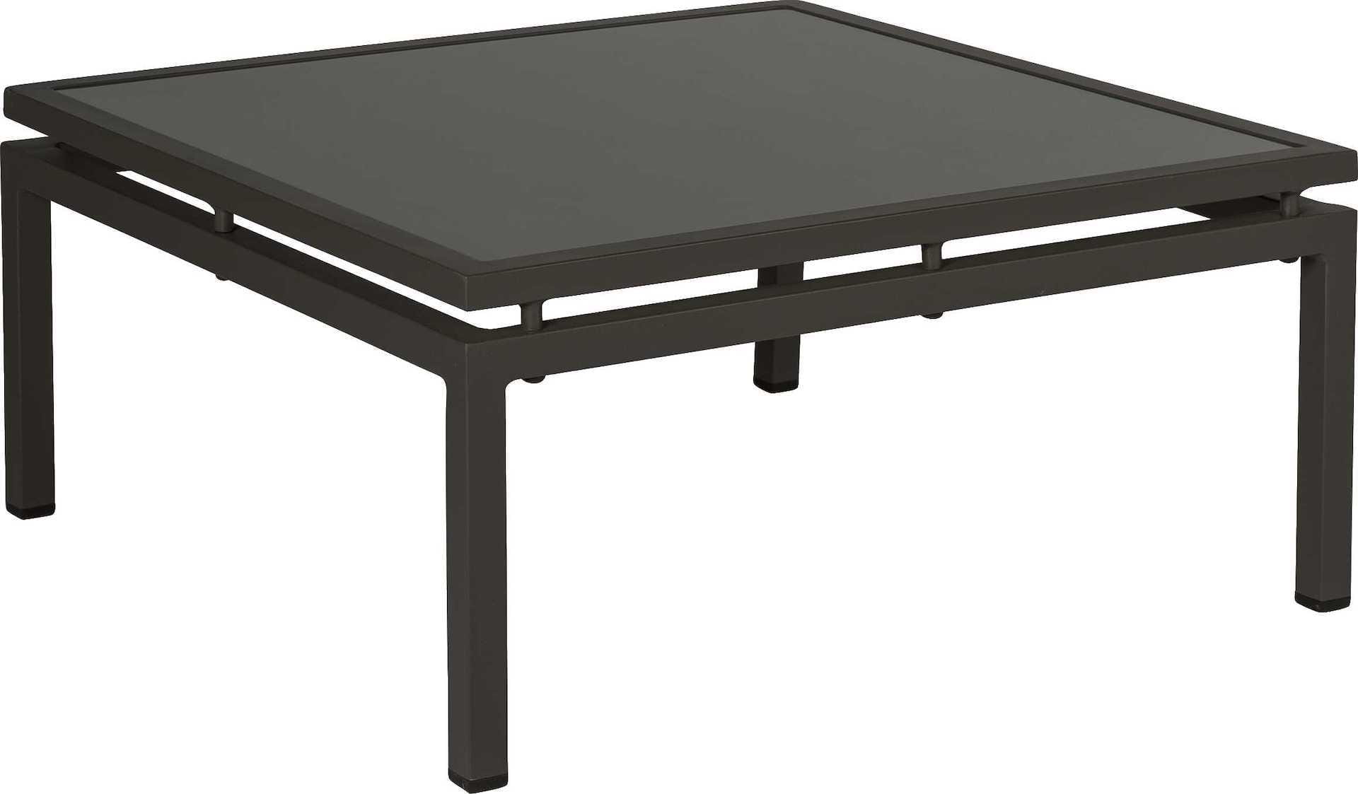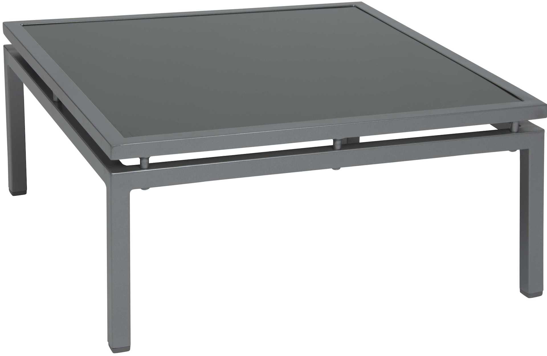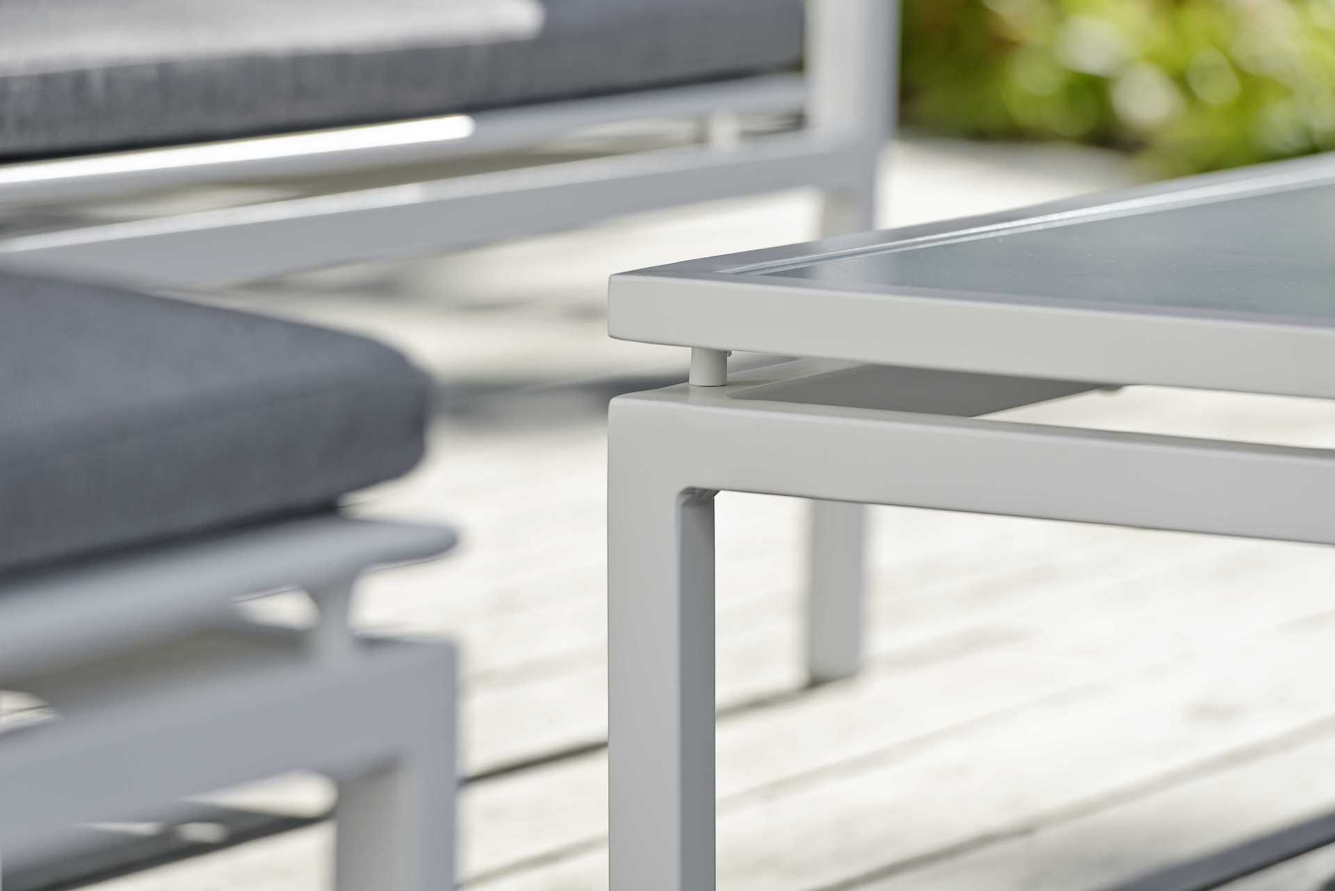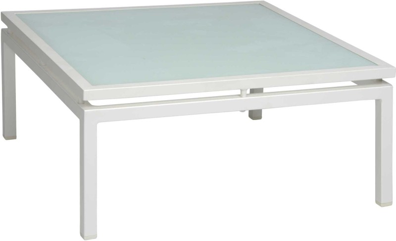 Kwadratowy szklany blat i prosty, aluminiowy stelaż w wyjątkowej formie.