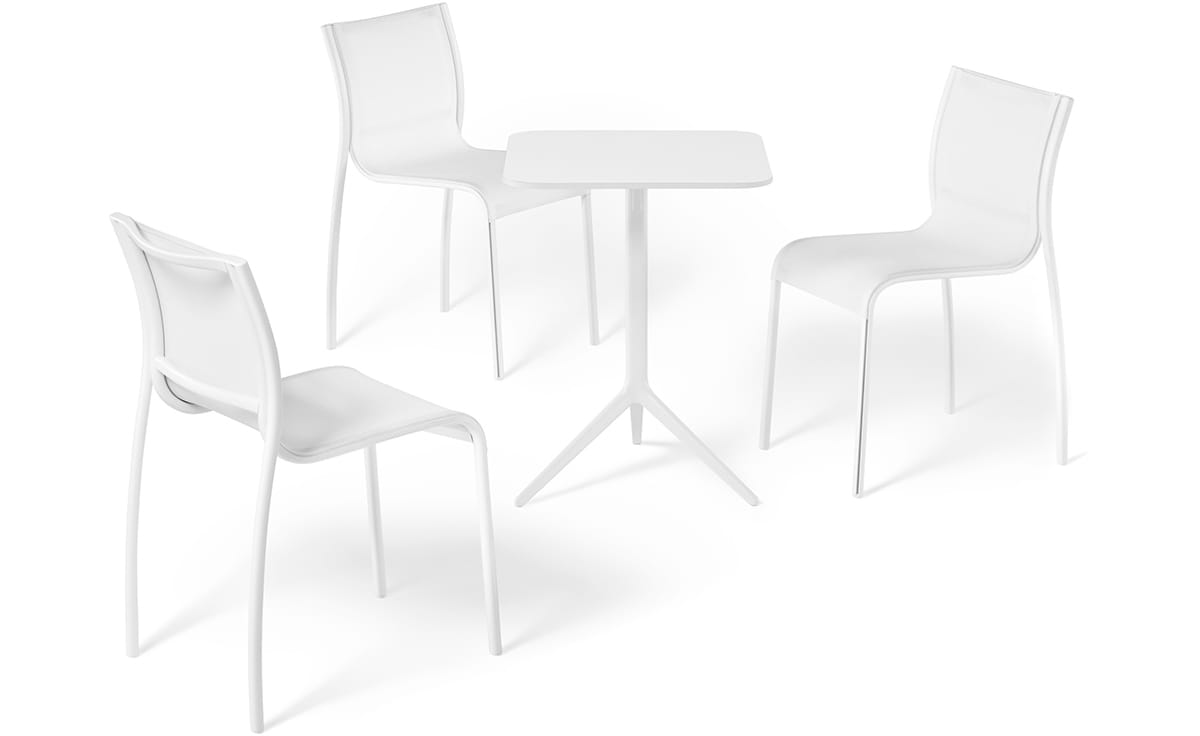 To lunchowy stół ogrodowy, stawiający na prostą formę, 3 nogi wraz z centralną pojedyncza nogą