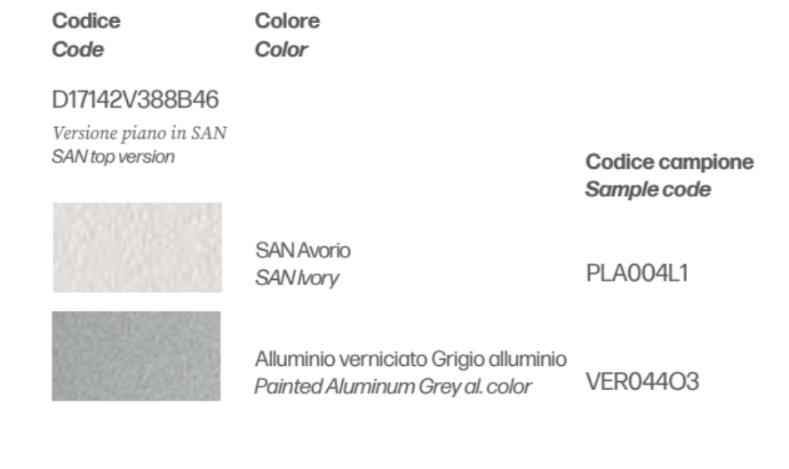 Aluminiowa podstawa malowana na kolor szary. Blat SAN z wykończeniem powierzchni wykonanym ręcznie za pomocą szpatułki z kolorowej mieszanki na bazie glinki.