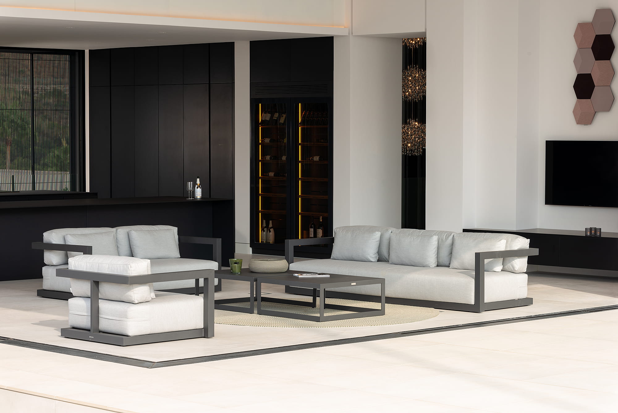 Uniwersalny zestaw stolików kawowych Burford. Znakomicie równoważą lekką, przewiewną ramę z ceramicznym lub aluminiowym wykończeniem blatu, dostępnymi w różnych kształtach i kombinacjach kolorystycznych.