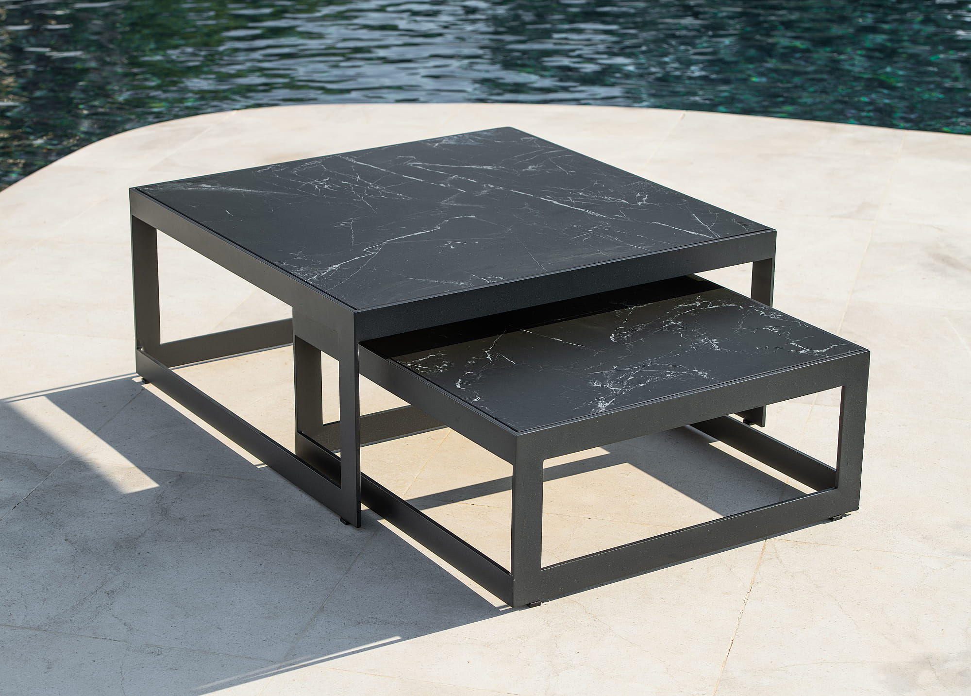 Uniwersalny zestaw stolików kawowych Burford. Znakomicie równoważą lekką, przewiewną ramę z ceramicznym lub aluminiowym wykończeniem blatu, dostępnymi w różnych kształtach i kombinacjach kolorystycznych.