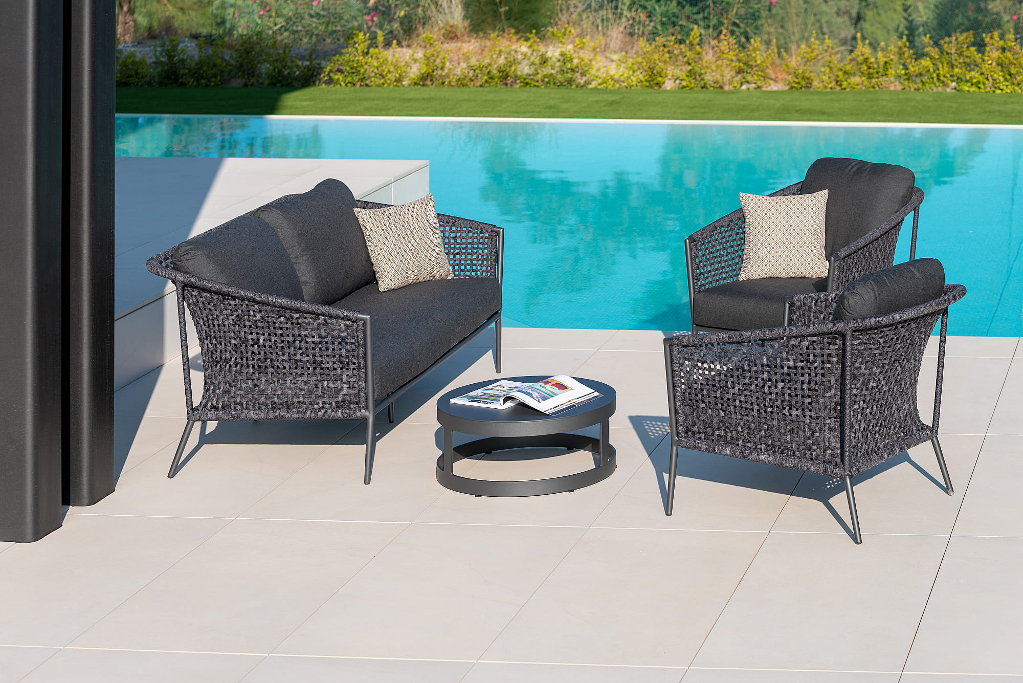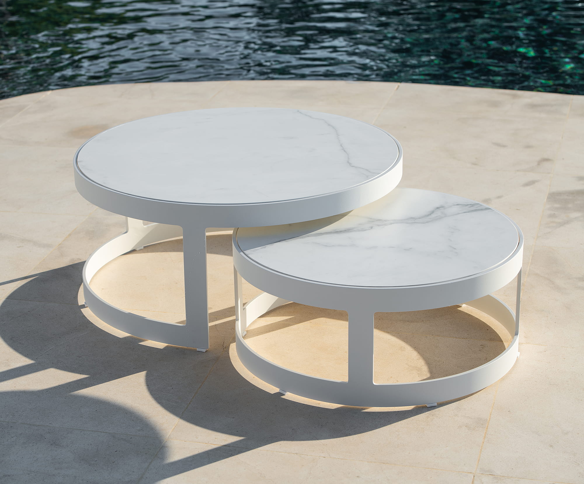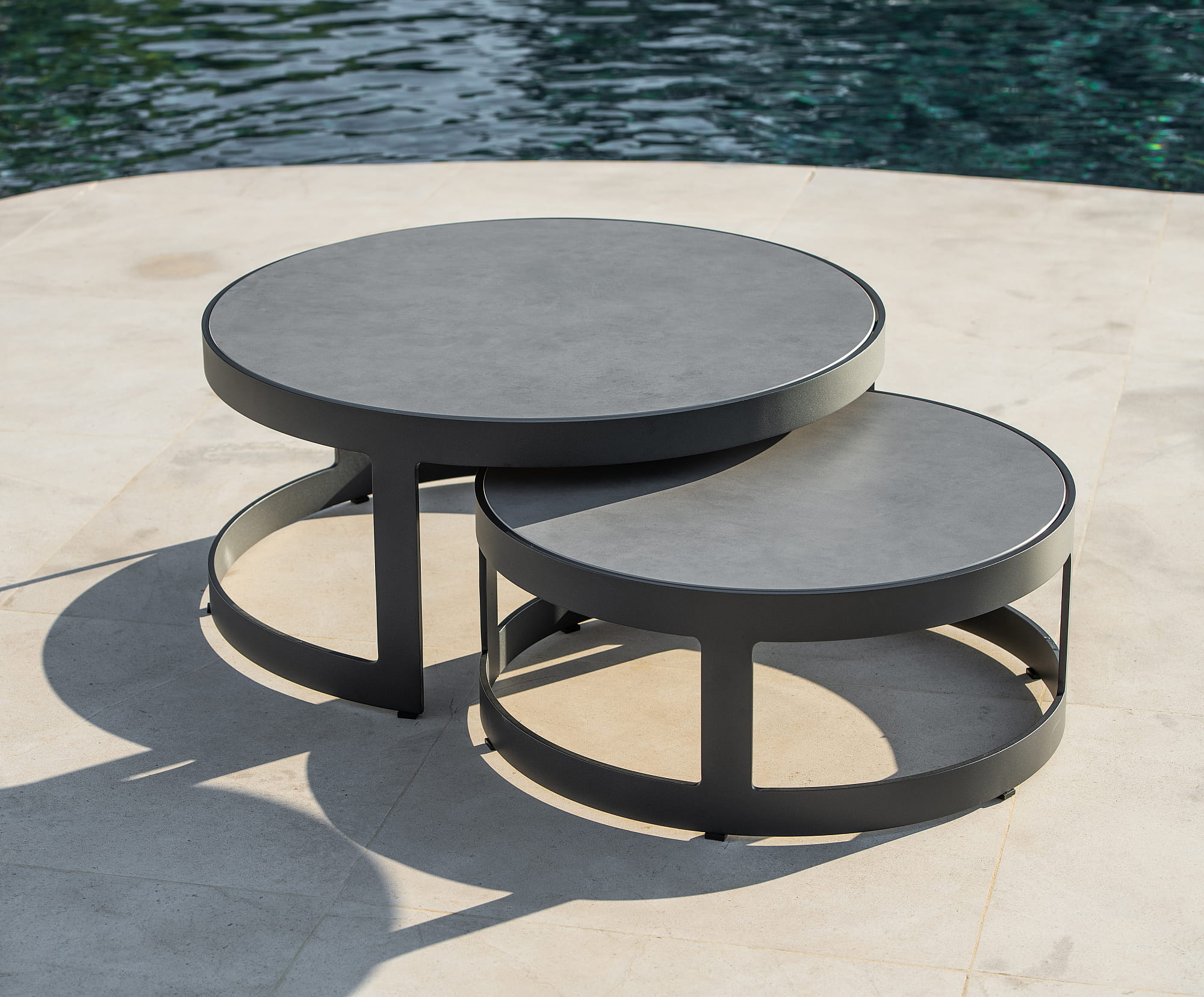Uniwersalny zestaw stolików kawowych Burford. Znakomicie równoważą lekką, przewiewną ramę z ceramicznym lub aluminiowym wykończeniem blatu, dostępnymi w różnych kształtach i kombinacjach kolorystycznych.