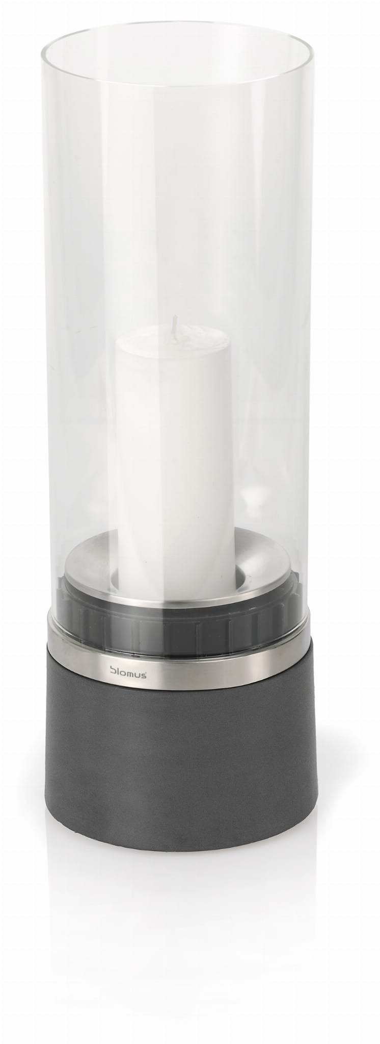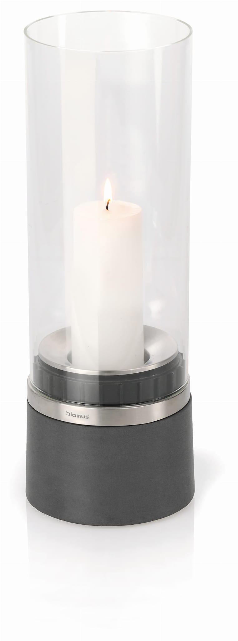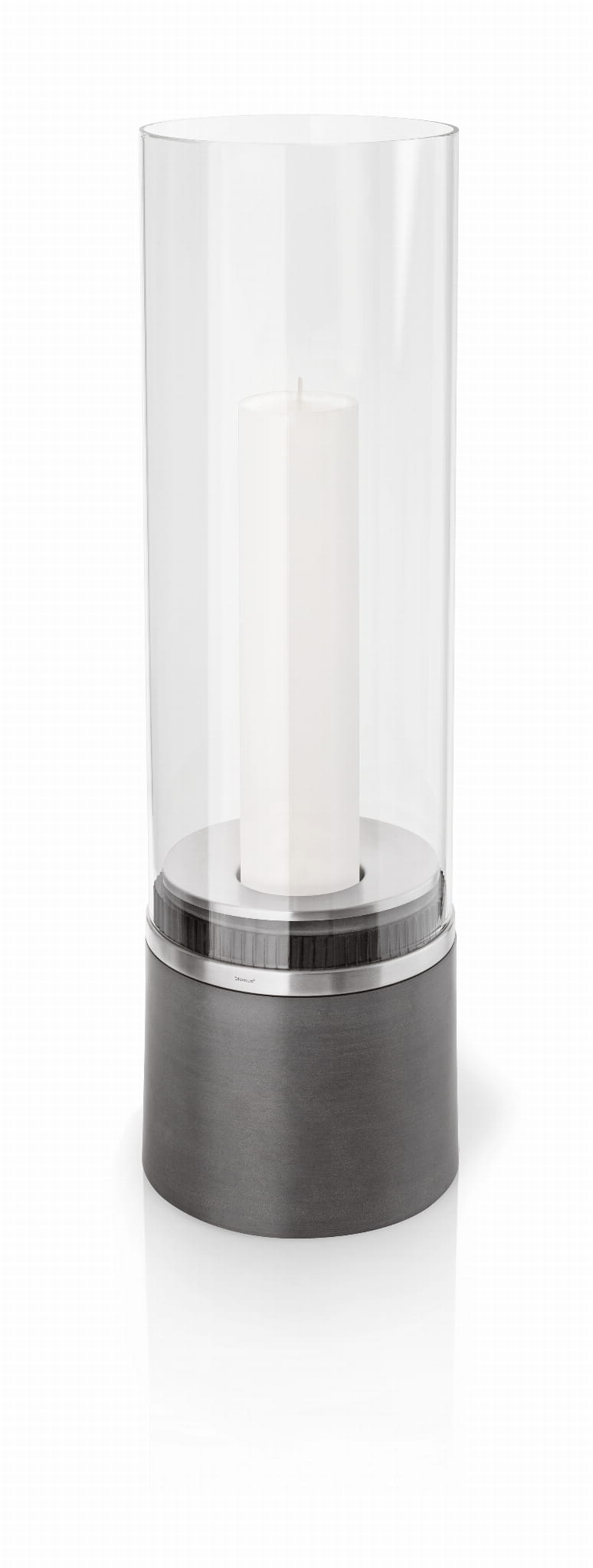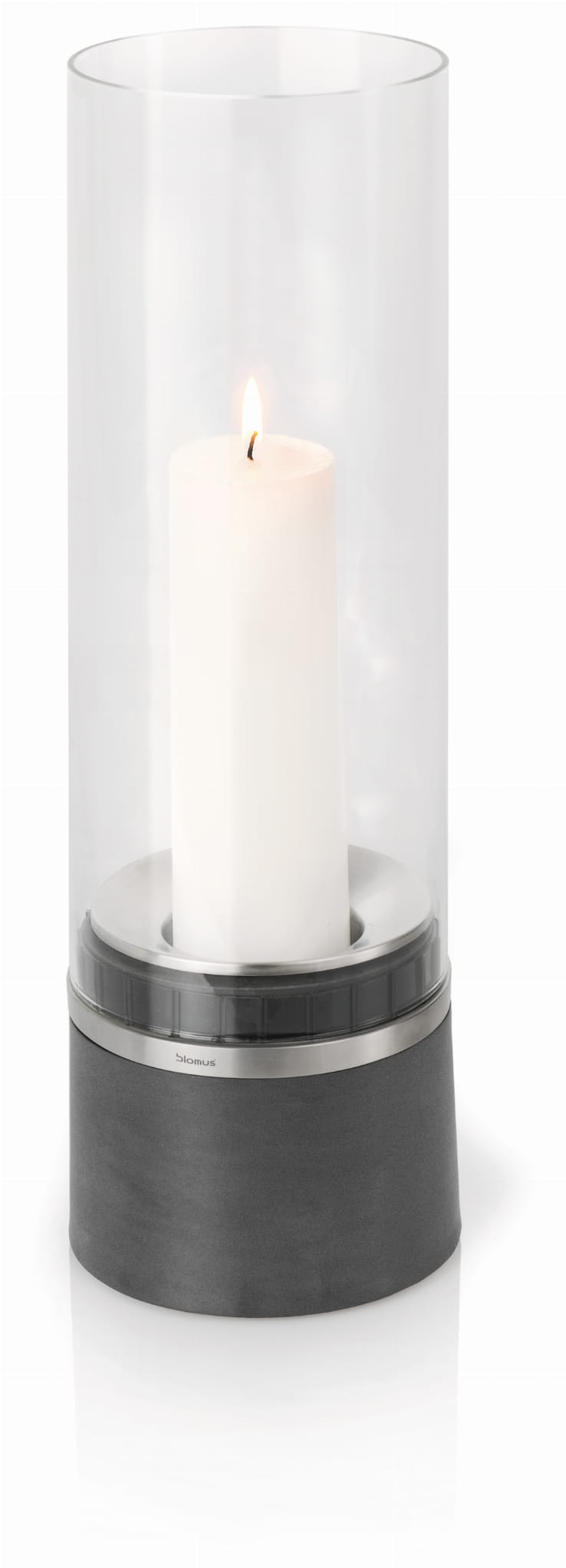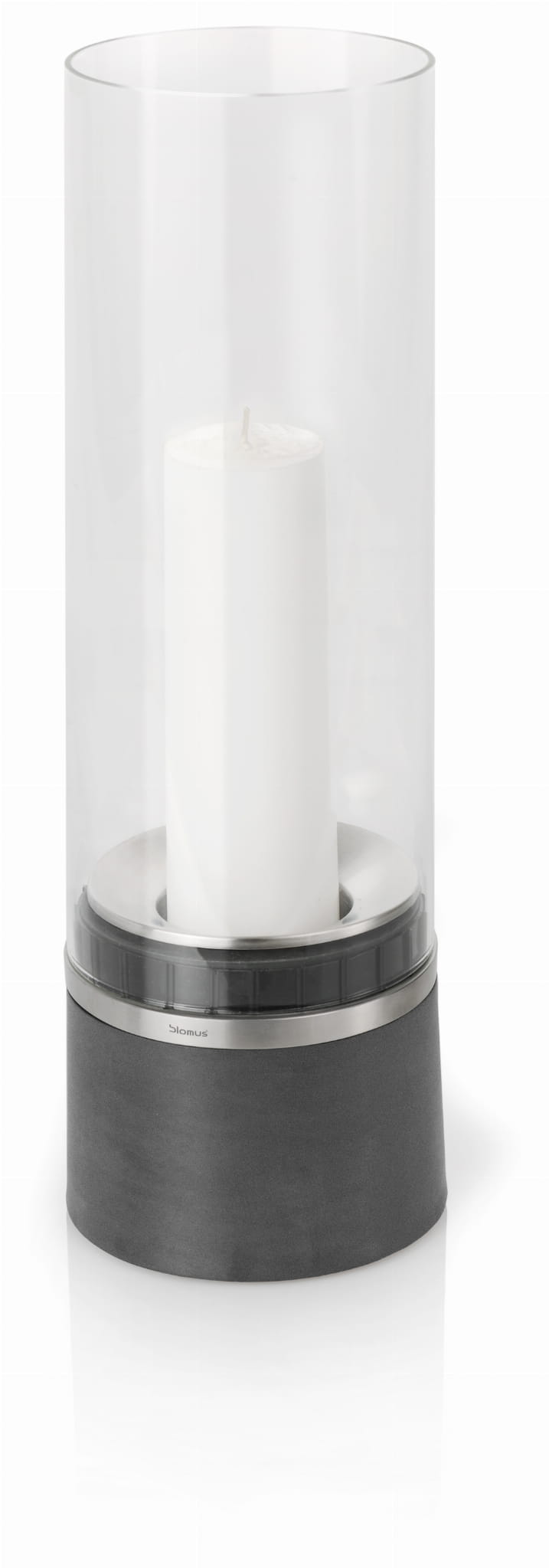 Posiada stabilną, kamienną podstawę w kolorze czarnymi jest wyposażony jest w wysoki klosz wykonany ze szkła satynowego, który chroni płomień przed wiatrem.