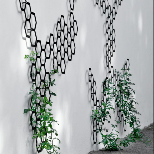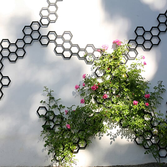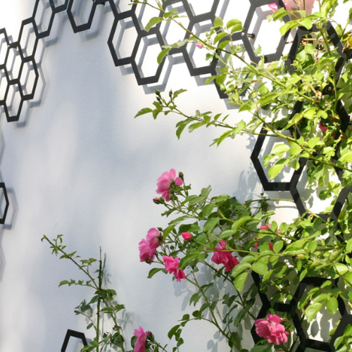 Różne rozmiary tej kratki na pnącza pozwalają na tworzenie naturalnych kształtów i wzorów na ścianie.