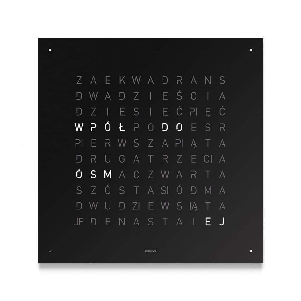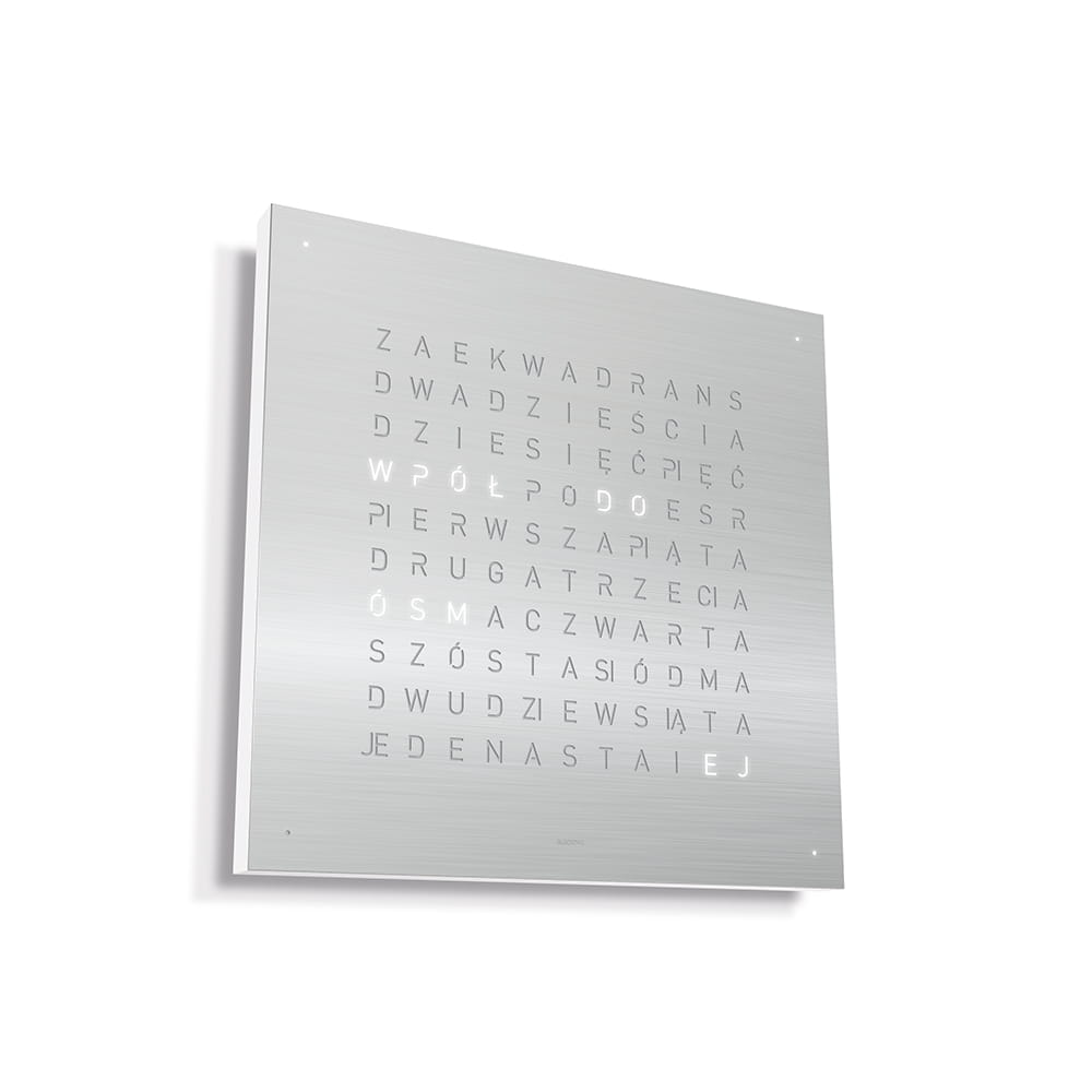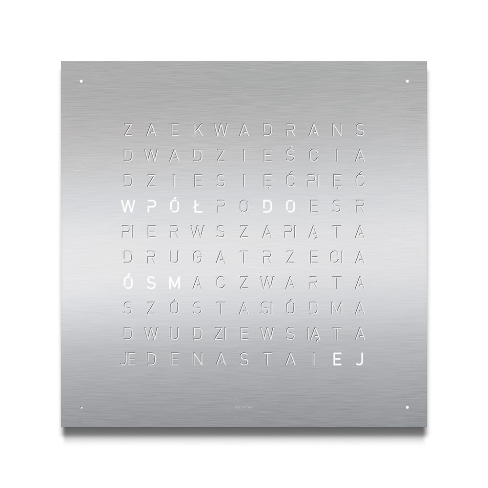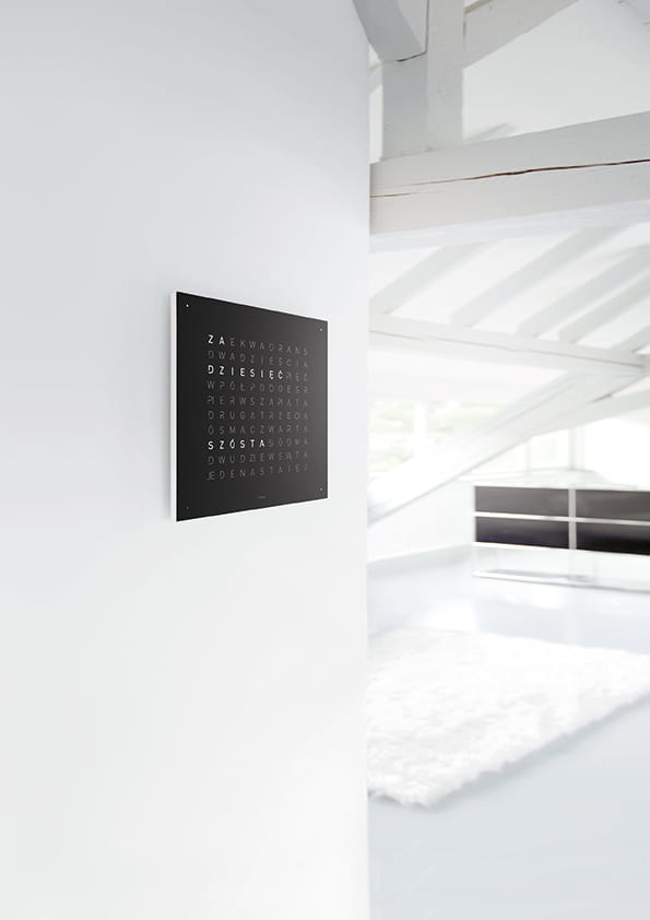 Zegar QLOCKTWO wskazuje czas typograficznie w ponad 20 językach (wybrane modele także w wersji polskiej).
