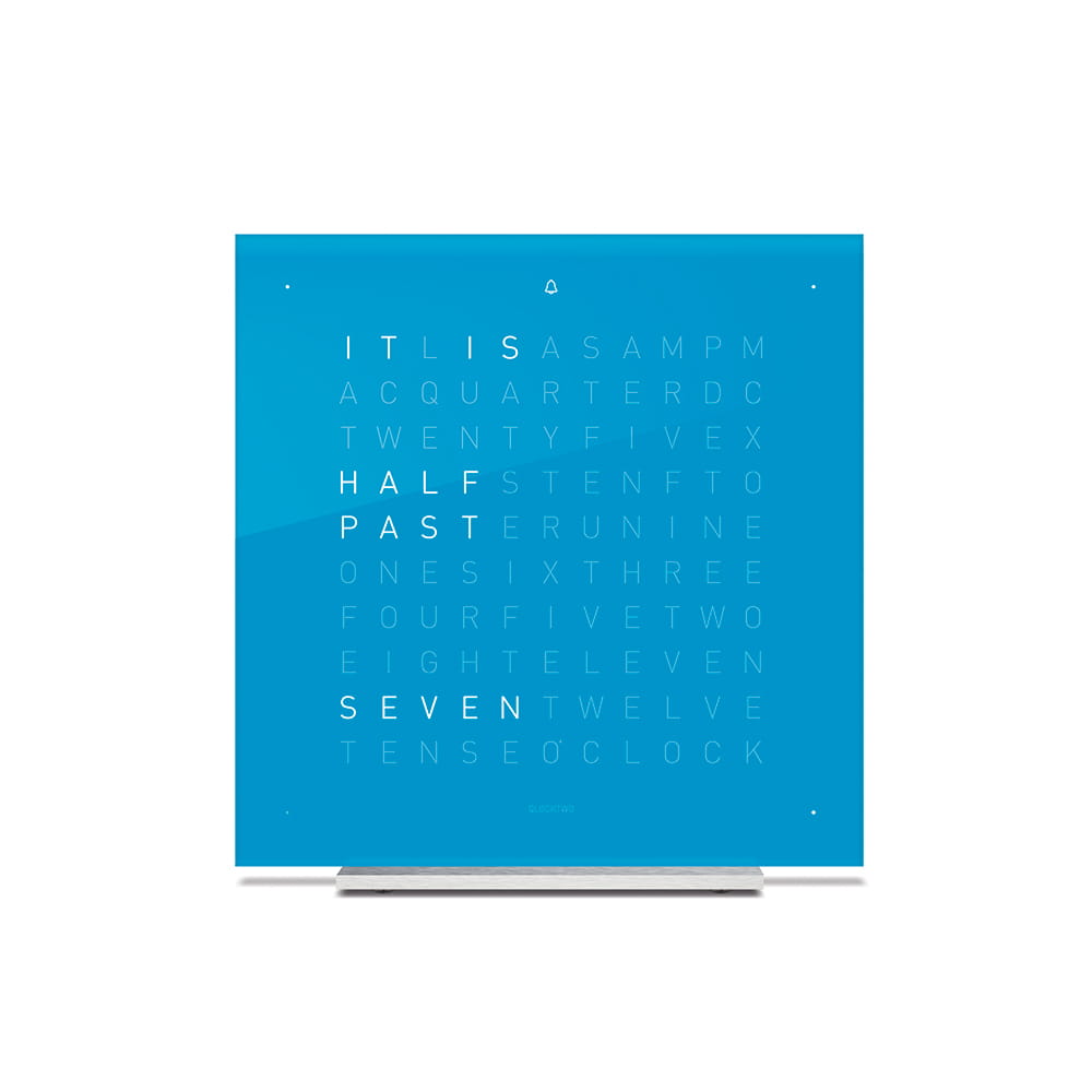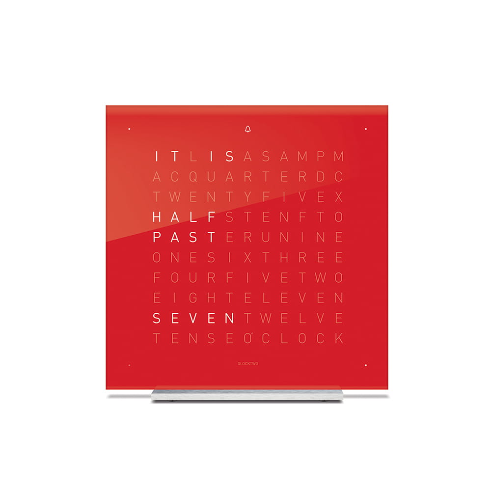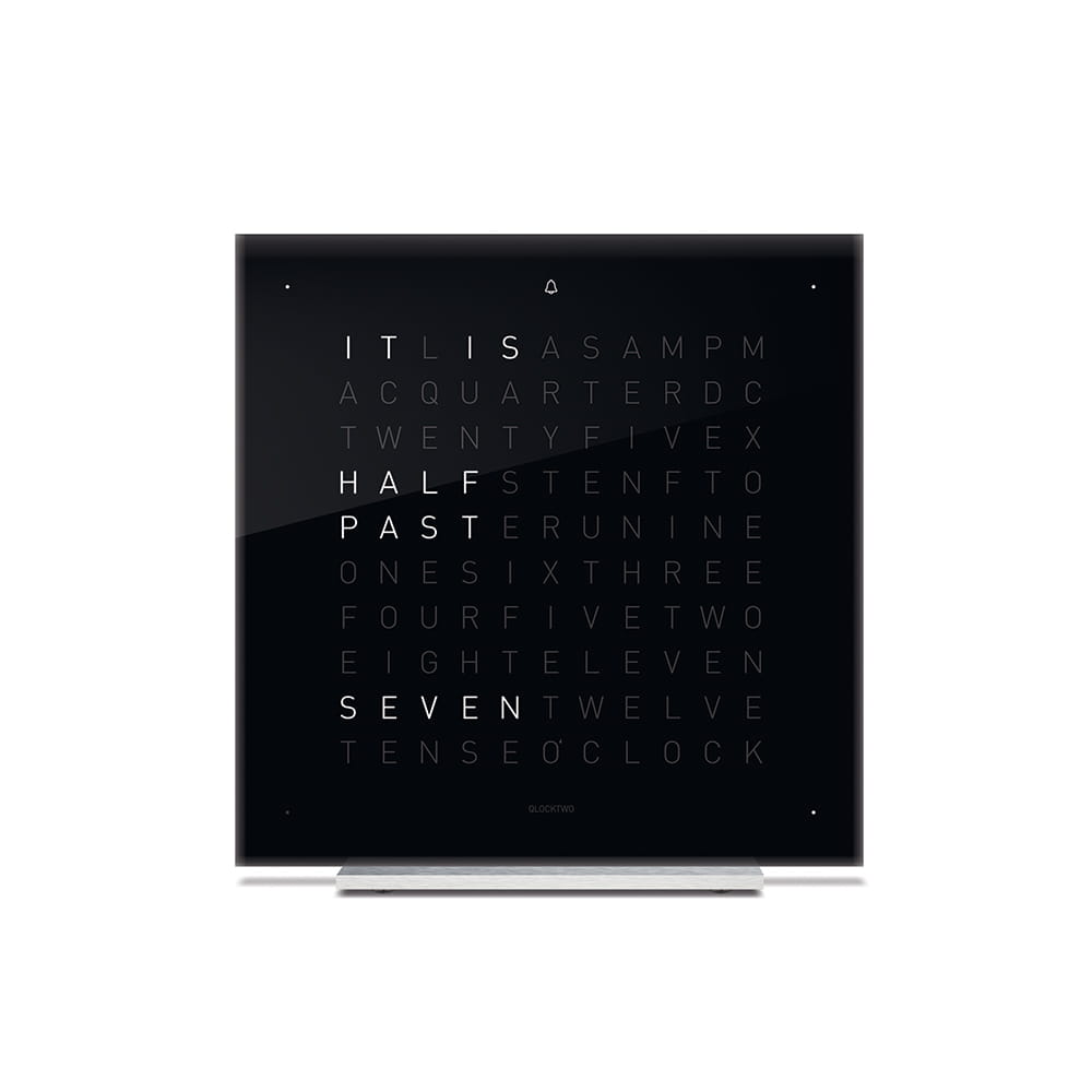 Kompaktowy QLOCKTWO TOUCH w rozmiarze 13.5x13.5 cm to idealny obiekt dekoracyjny z funkcją zegara i alarmu.