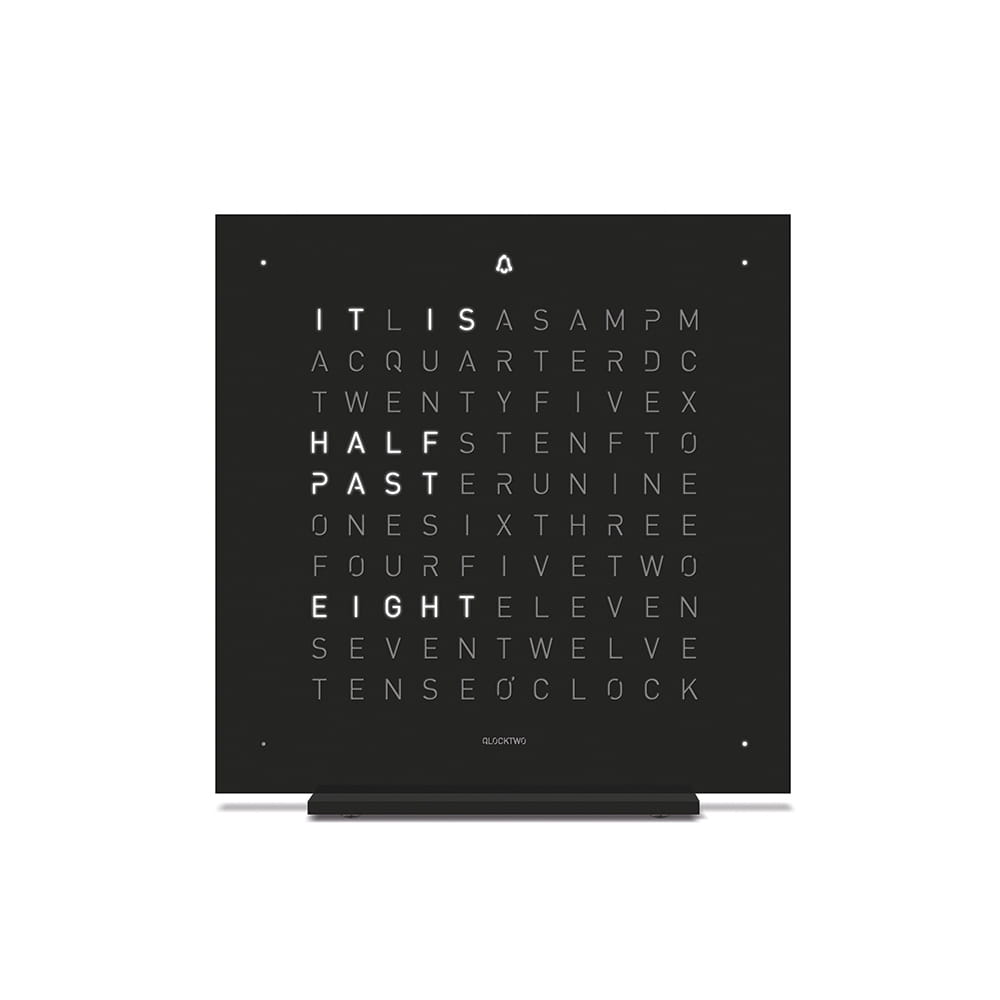 Kompaktowy QLOCKTWO TOUCH w rozmiarze 13.5x13.5 cm to idealny obiekt dekoracyjny z funkcją zegara i alarmu.