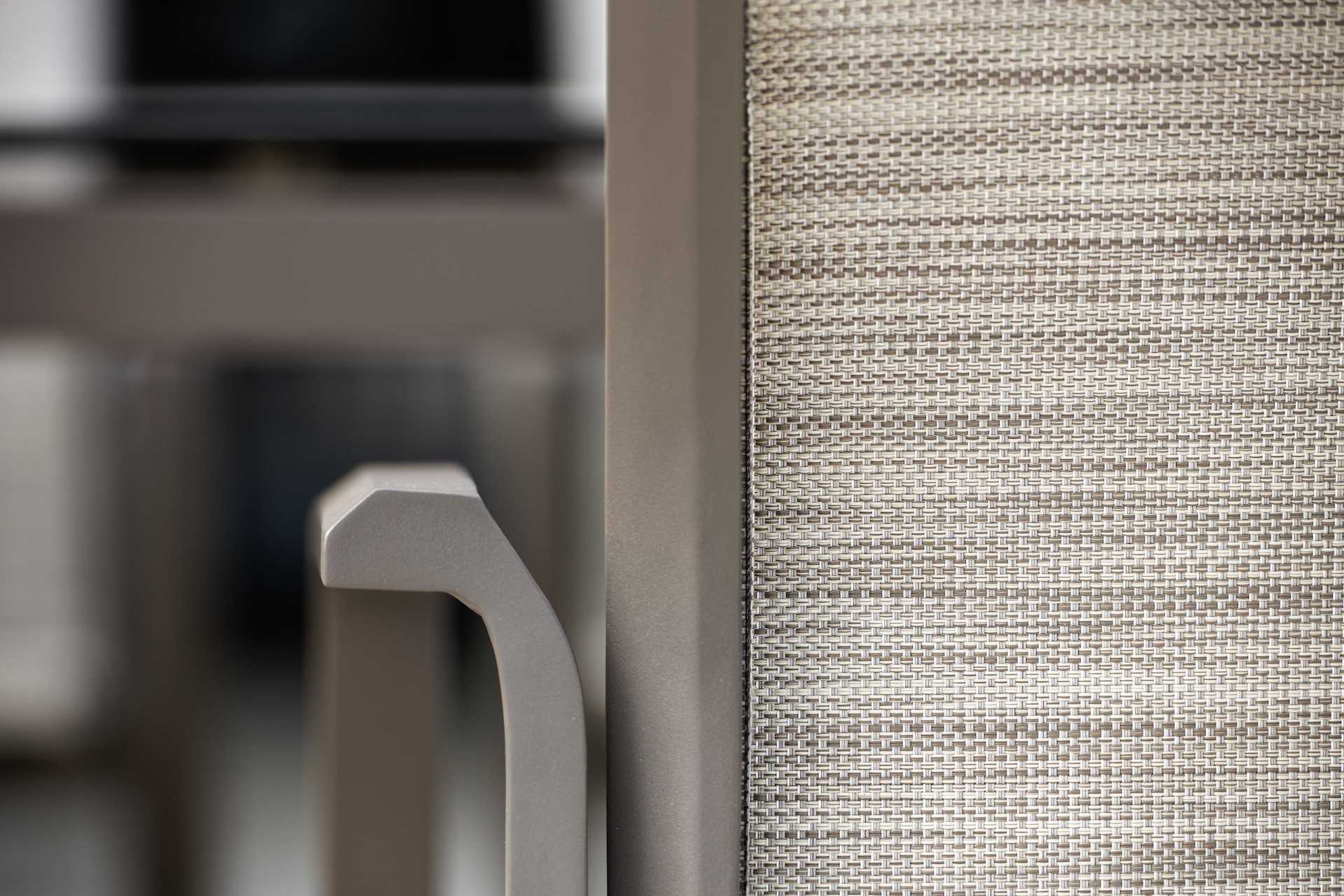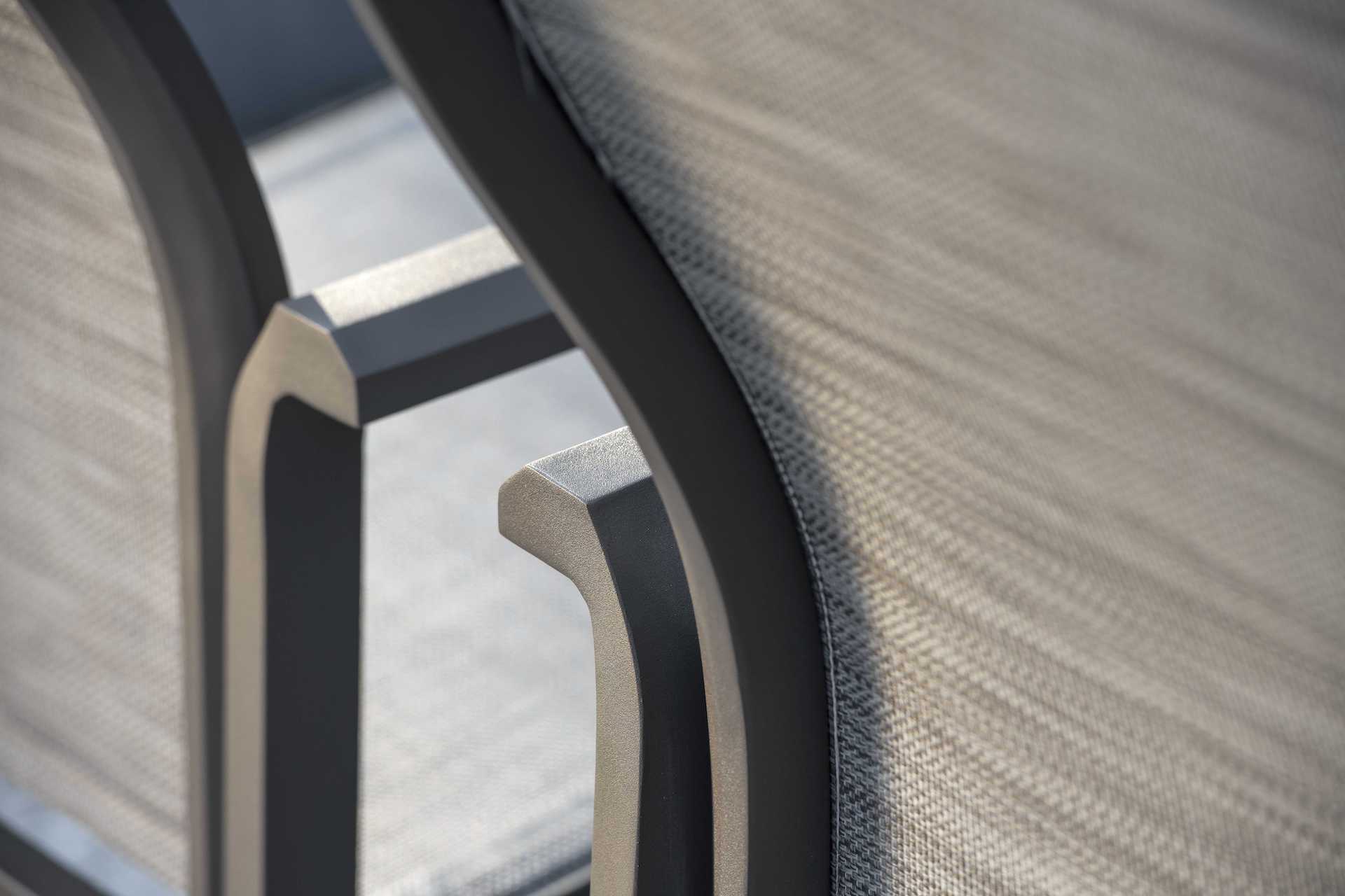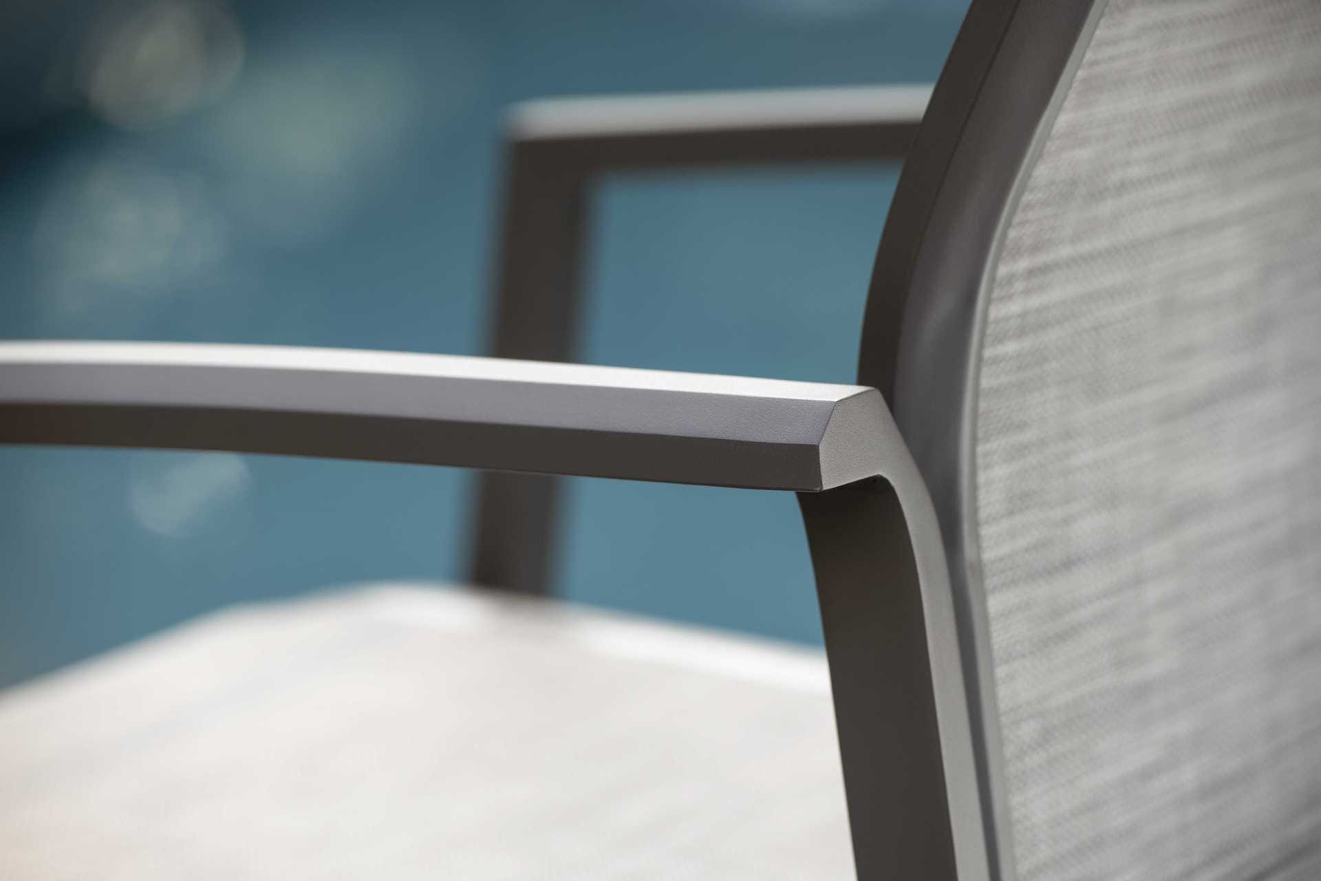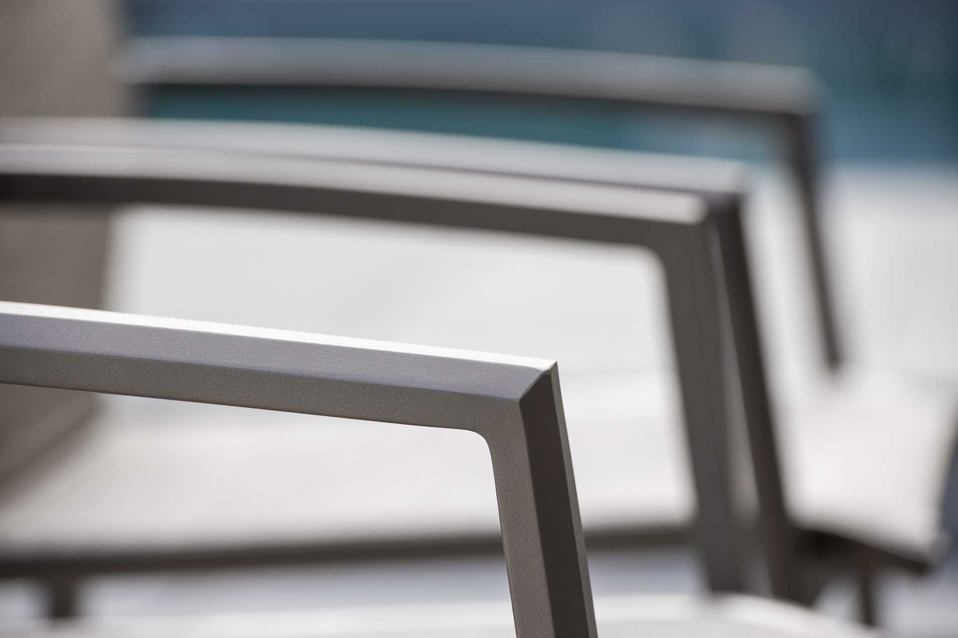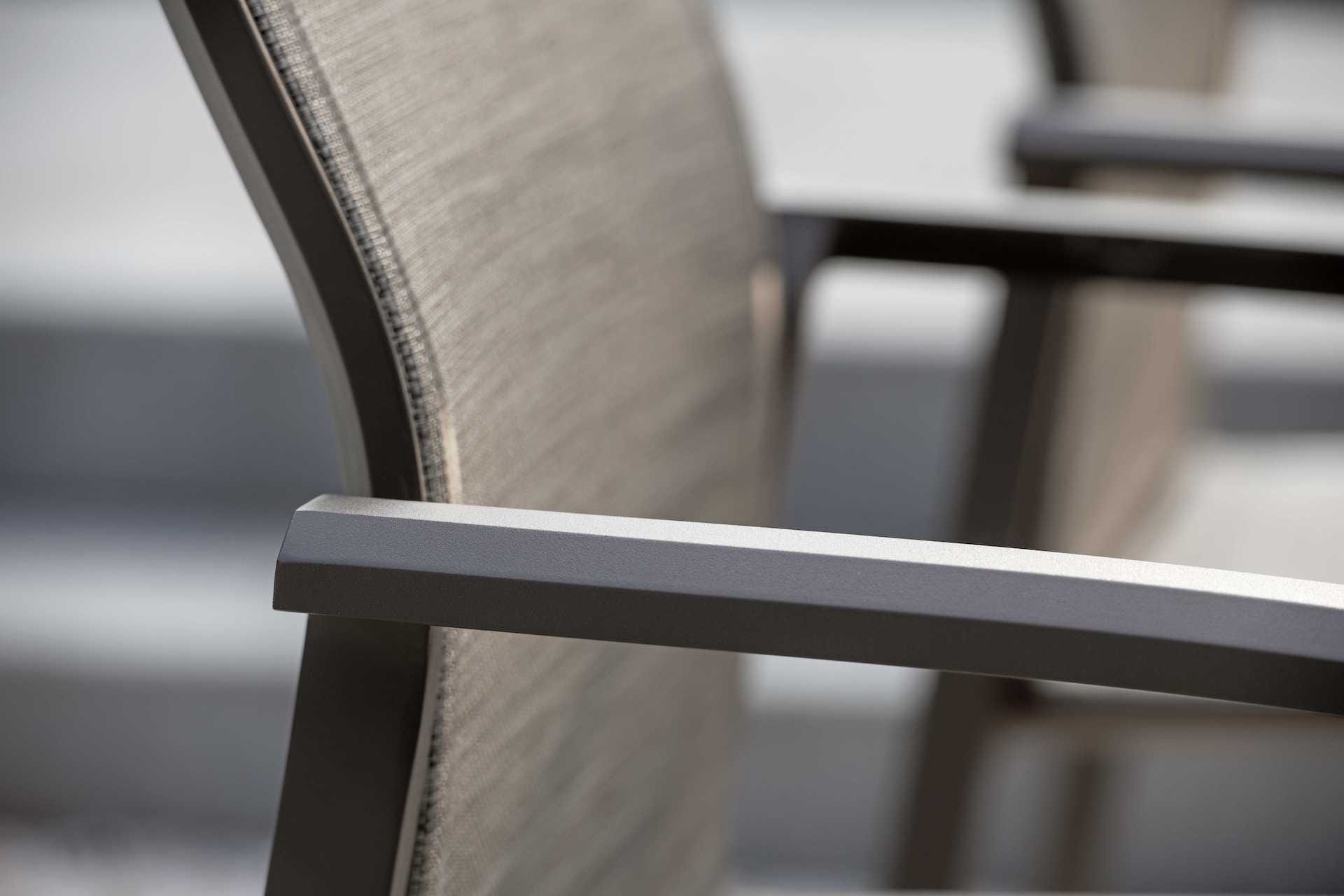 KARI to seria krzeseł i foteli ogrodowych o lekkiej, aluminiowej konstrukcji i siedziskiem z materiału Textilen w formie siateczki.