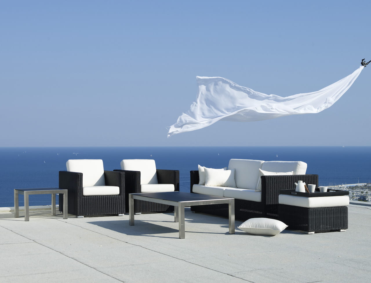 Ta seria mebli ogrodowych składa się z sofy, fotela i podnóżka / niskiego stolika kawowego. Jakość użytych materiałów pozwala na użytkowanie ich całorocznie na zewnątrz.