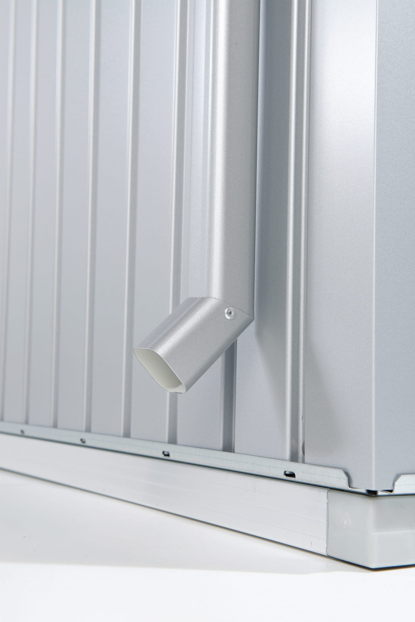 Zestaw rynnowy z kolankiem wylotowym z ocynkowanej ogniowo blachy stalowej powlekanej lakierem piecowym z poliamidem.