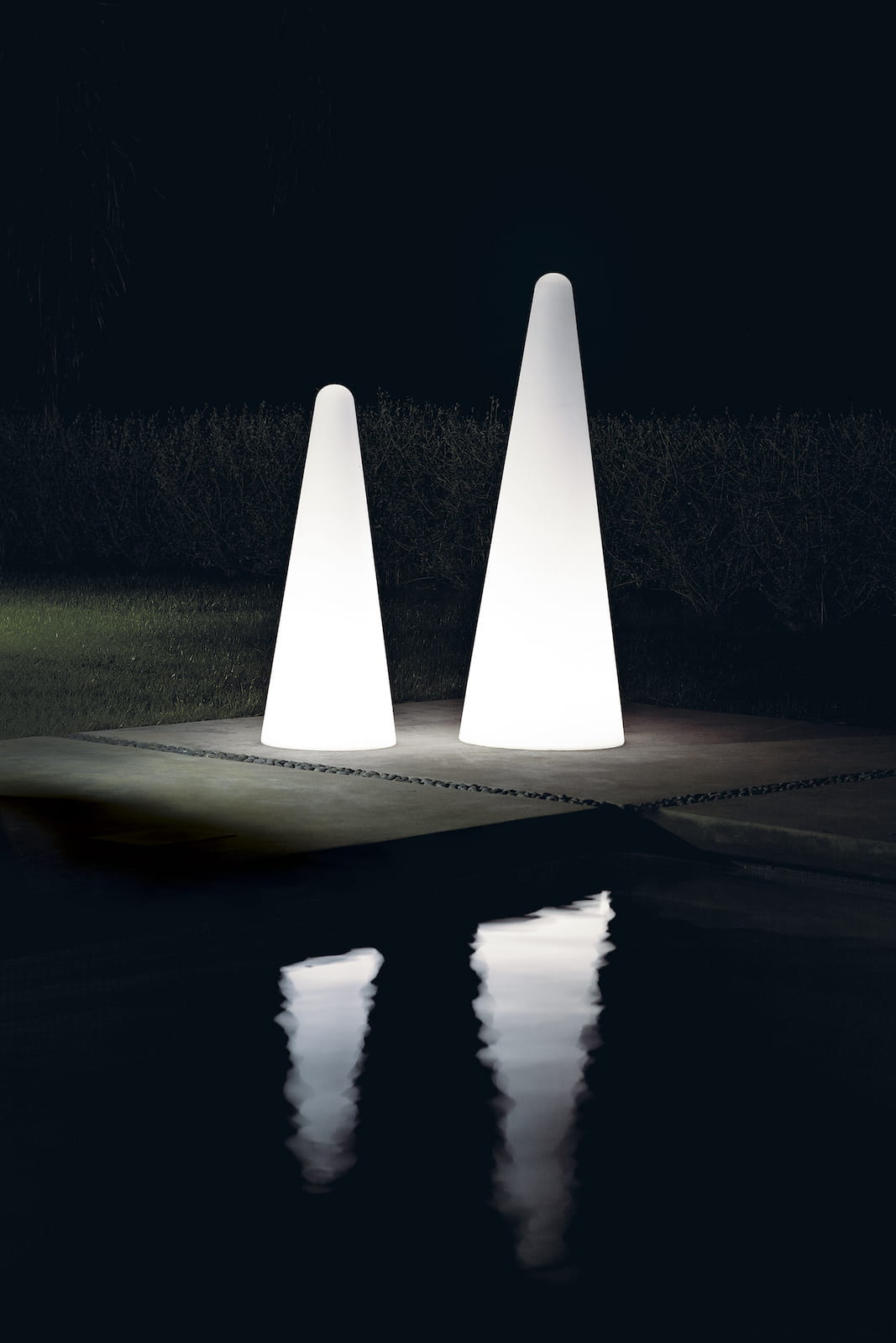 Lampa ogrodowa CONO nadaje sennej i eleganckiej atmosfery, dzięki lśnieniu ze środka wzdłuż lampy w górę.